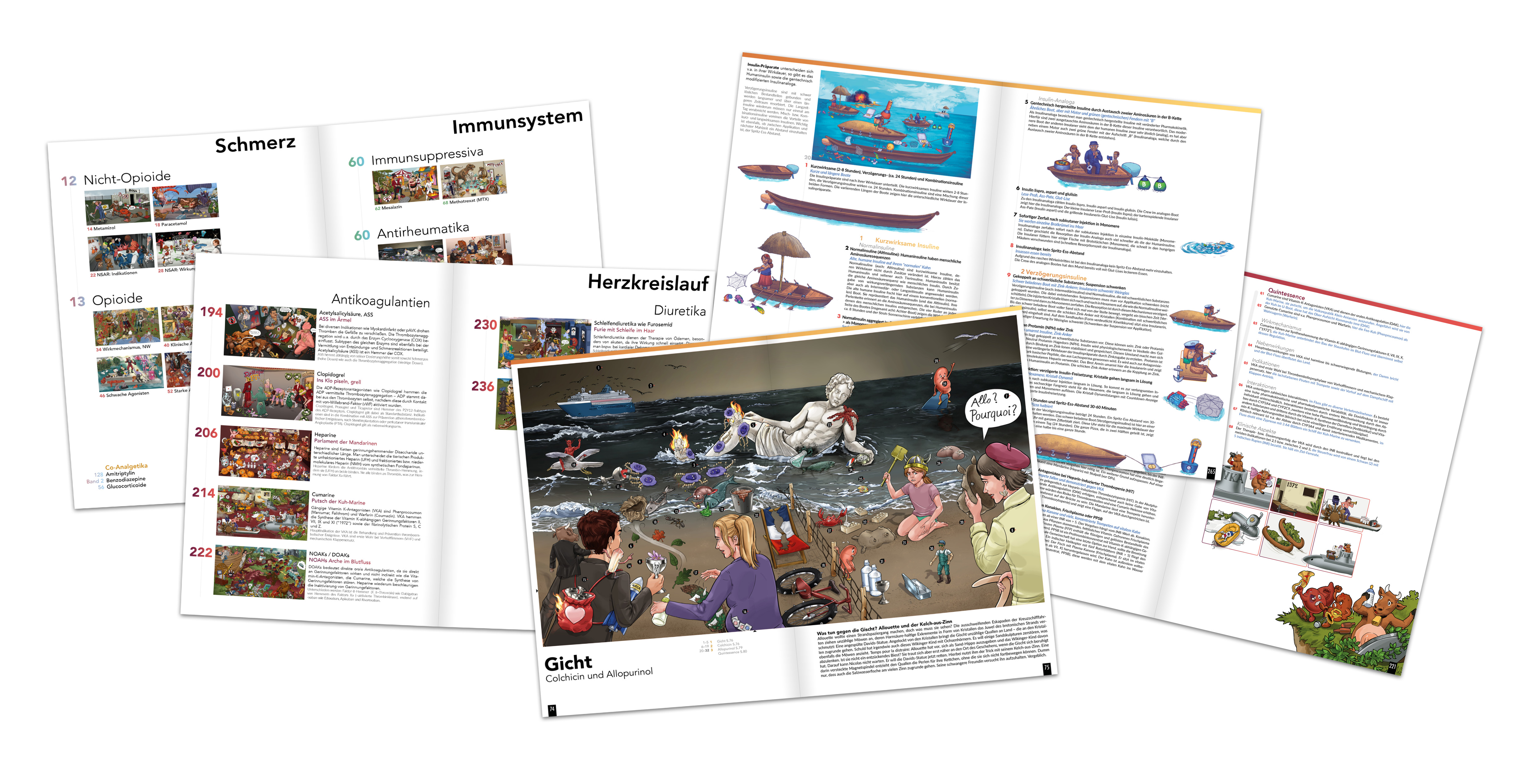Die 100 Pharmaka beinhaltet 100 Medikamente, die man kenne sollte – aufgeteilt auf zwei Bände. Das essentielle Wissen wird durch Merkbilder vermittelt. Diese Technik nutzen auch Gedächtnisweltmeister/innen. Wissen wird so länger behalten.