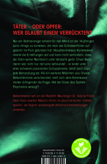 Täter – oder Opfer: Wer glaubt einem Verrückten? Im 2. Teil der Medizin-Krimis um Kommissar Kammowski gerät ein Psychiatrie-Patient unter Mordverdacht. Hochspannend und beklemmend nah an der Realität: Die Autorin Dr. Sabine Fitzek, Neurologin mit 10-jähriger Chefarzt-Erfahrung, entwickelt die Fälle ihrer Krimi-Reihe rund um Missstände im Gesundheitswesen mit großem Insider-Wissen.
