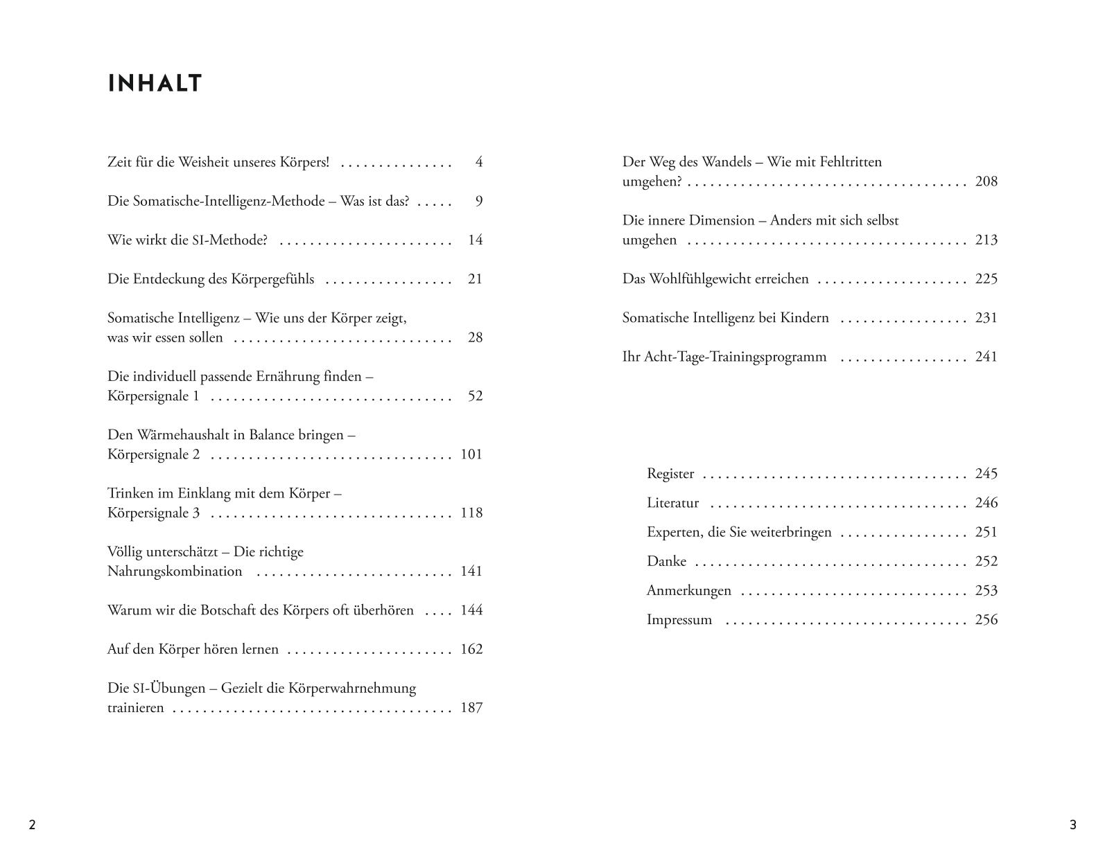 Hinweis zur OptimierungImpressumWichtiger HinweisDieses Buch hilft Ihnen ...Zeit für die Weisheit unseres Körpers!Die Somatische-Intelligenz-Methode - Was ist das?Wie wirkt die SI-Methode?Die Entdeckung des KörpergefühlsSomatische Intelligenz - Wie uns der Körper zeigt, was wir essen sollenDie individuell passende Ernährung finden - Körpersignale 1Den Wärmehaushalt in Balance bringen - Körpersignale 2Trinken im Einklang mit dem Körper - Körpersignale 3Völlig unterschätzt - Die richtige NahrungskombinationWarum wir die Botschaft des Körpers oft überhörenAuf den Körper hören lernenDie SI-Übungen - Gezielt die Körperwahrnehmung trainierenDer Weg des Wandels - Wie mit Fehltritten umgehen?Die innere Dimension - Anders mit sich selbst umgehenDas Wohlfühlgewicht erreichenSomatische Intelligenz bei KindernIhr Acht-Tage-TrainingsprogrammLiteraturExperten, die Sie weiterbringenDankeAnmerkungenDer Autor