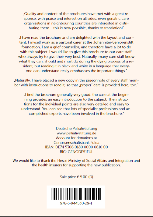 Quality and content of the brochures have met with a great re-sponse, with praise and interest on all sides, even geriatric care organisations in neighbouring countries are interested in distri-buting them – this is now possible, thanks to translation!“„I have read the brochure and am delighted with the layout and con-tent. I myself work as a pastoral carer at the Johanniter-Seniorenstift foundation, I am a grief counsellor, and therefore have a lot to do with this subject. I would like to give this brochure to our care staff, who always try to give their very best. Naturally, many care staff know what they can, should and must do during the dying process of a re-sident, but reading it in black and white in a language that every-one can understand really emphasises the important things.“„Naturally, I have placed a new copy in the pigeonhole of every staff mem-ber with instructions to read it, so that „proper“ care is provided here, too.“„I find the brochure generally very good, the case at the begin-ning provides an easy introduction to the subject. The instruc-tions for the individual points are also very detailed and easy to understand. You can see that lots of specialist professions and ac-complished experts have been involved in the brochure.