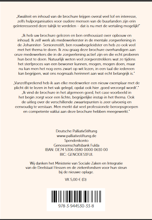 „Kwaliteit en inhoud van de brochure krijgen overal veel lof en interesse, zelfs hulporganisaties voor oudere mensen van de buurlanden zijn erin geïnteresseerd deze talrijk te verdelen – dat is nu met de vertaling mogelijk!“„Ik heb uw brochure gelezen en ben enthousiast over opbouw en inhoud. Ik zelf werk als medewerkerster in de mentale zorgverlening in de Johanniter- Seniorenstift, ben rouwbegeleidster en heb zo ook veel met het thema te doen. Ik zou graag deze brochure overhandigen aan onze medewerkers die in de zorgverlening actief zijn en die echt proberen hun best te doen. Natuurlijk weten veel zorgverstrekkers wat ze tijdens het sterfproces van een bewoner kunnen, mogen, mogen doen, maar nu kan men het nog eens zwart op wit lezen, in een taal die iedereen kan begrijpen, wat ons nogmaals herinnert aan wat echt belangrijk is.“„Vanzelfsprekend heb ik aan elke medewerker een nieuw exemplaar met de plicht dit te lezen in het vak gelegd, opdat ook hier ‚goed verzorgd wordt‘.“„Ik vind de brochure in het algemeen goed, het case voorbeeld in het begin zorgt voor een lichte, begrijpelijke instap in het thema. Ook de uitleg over de verschillende zwaartepunten is zeer uitvoerig en eenvoudig te verstaan. Men merkt dat veel professionele beroepsgroepen en competente vaklui aan deze brochure hebben meegewerkt.
