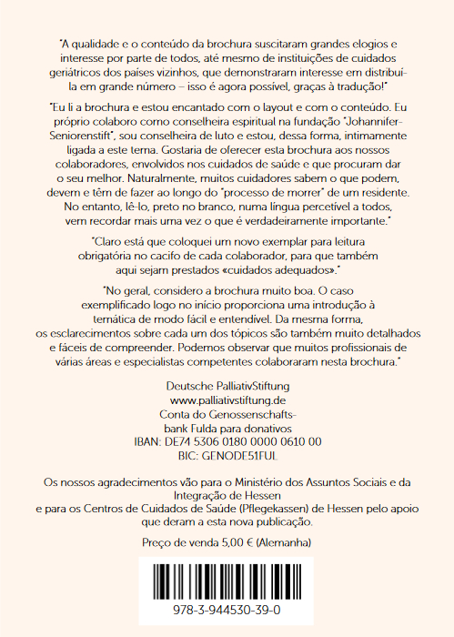A qualidade e o conteúdo da brochura suscitaram grandes elogios e interesse por parte de todos, até mesmo de instituições de cuidados geriátricos dos países vizinhos, que demonstraram interesse em distribuí-la em grande número – isso é agora possível, graças à tradução!”“Eu li a brochura e estou encantado com o layout e com o conteúdo. Eu próprio colaboro como conselheira espiritual na fundação “Johannifer-Seniorenstift”, sou conselheira de luto e estou, dessa forma, intimamente ligada a este tema. Gostaria de oferecer esta brochura aos nossos colaboradores, envolvidos nos cuidados de saúde e que procuram daro seu melhor. Naturalmente, muitos cuidadores sabem o que podem, devem e têm de fazer ao longo do “processo de morrer” de um residente. No entanto, lê-lo, preto no branco, numa língua percetível a todos, vem recordar mais uma vez o que é verdadeiramente importante.”“Claro está que coloquei um novo exemplar para leitura obrigatória no cacifo de cada colaborador, para que também aqui sejam prestados «cuidados adequados».”“No geral, considero a brochura muito boa. O caso exemplificado logo no início proporciona uma introdução à temática de modo fácil e entendível. Da mesma forma,os esclarecimentos sobre cada um dos tópicos são também muito detalhados e fáceis de compreender. Podemos observar que muitos profissionais de várias áreas e especialistas competentes colaboraram nesta brochura.