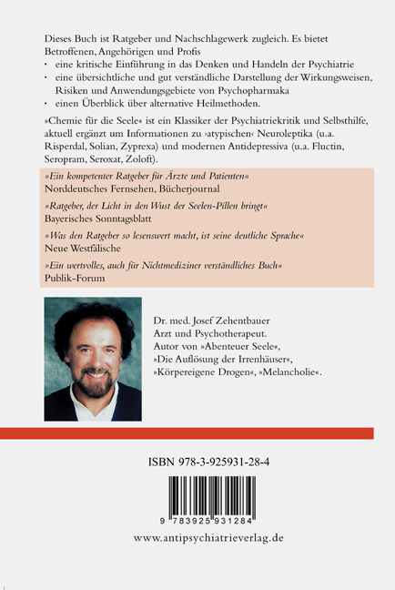 "Der Arzt und Psychotherapeut Joseph Zehentbauer stellt in 'Chemie für die Seele' die Wirkung von psychopharmakologischen Therapien und alternativen Heilmethoden umfassend dar. Seine Darstellung zeichnet sich durch zwei Besonderheiten aus: Ohne unzulässig zu vereinfachen, bedient er sich einer auch für medizinische Laien gut verständlichen Sprache. Im Gegensatz zu anderen Darstellungen der Behandlungsmöglichkeiten psychischer Probleme mit Hilfe von Medikamenten geht der Autor ausführlich auf die Gefahren durch unerwünschte Wirkungen dieser Mittel ein. … Der sachliche und einfühlsam reflektive Duktus macht dieses Buch zu einer ebenso angenehmen wie aufklärenden Lektüre. Große Empfehlung." (Lucinda Bee)