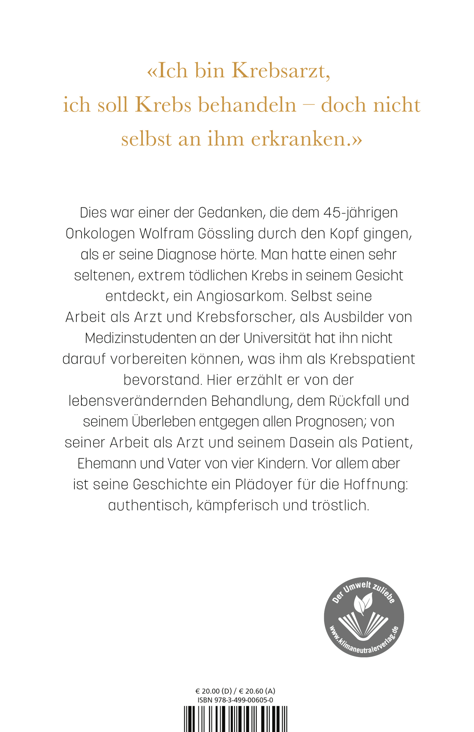 Der renommierte Krebsarzt und -forscher Wolfram Gössling war Mitte vierzig, als bei ihm ein extrem seltener, extrem tödlicher Krebs diagnostiziert wurde. Der Krebs, den zu bekämpfen er sich zur Lebensaufgabe gemacht hatte, bestimmte nun sein eigenes Leben. Hier erzählt er von der traumatischen Behandlung und seiner unwahrscheinlichen Heilung; von seiner Arbeit als Arzt und seinem Dasein als Patient, Ehemann und Vater von vier Kindern. Er spart dabei auch seine Ängste, die Trauer und die Wut nicht aus und erzählt, wie sehr diese Erfahrungen sein Handeln als Arzt beeinflusst haben: Er weiß nun, was seine Patienten durchmachen, wie sich eine Chemo anfühlt, und er scheut sich nicht davor, seine Erlebnisse mit ihnen zu teilen.
