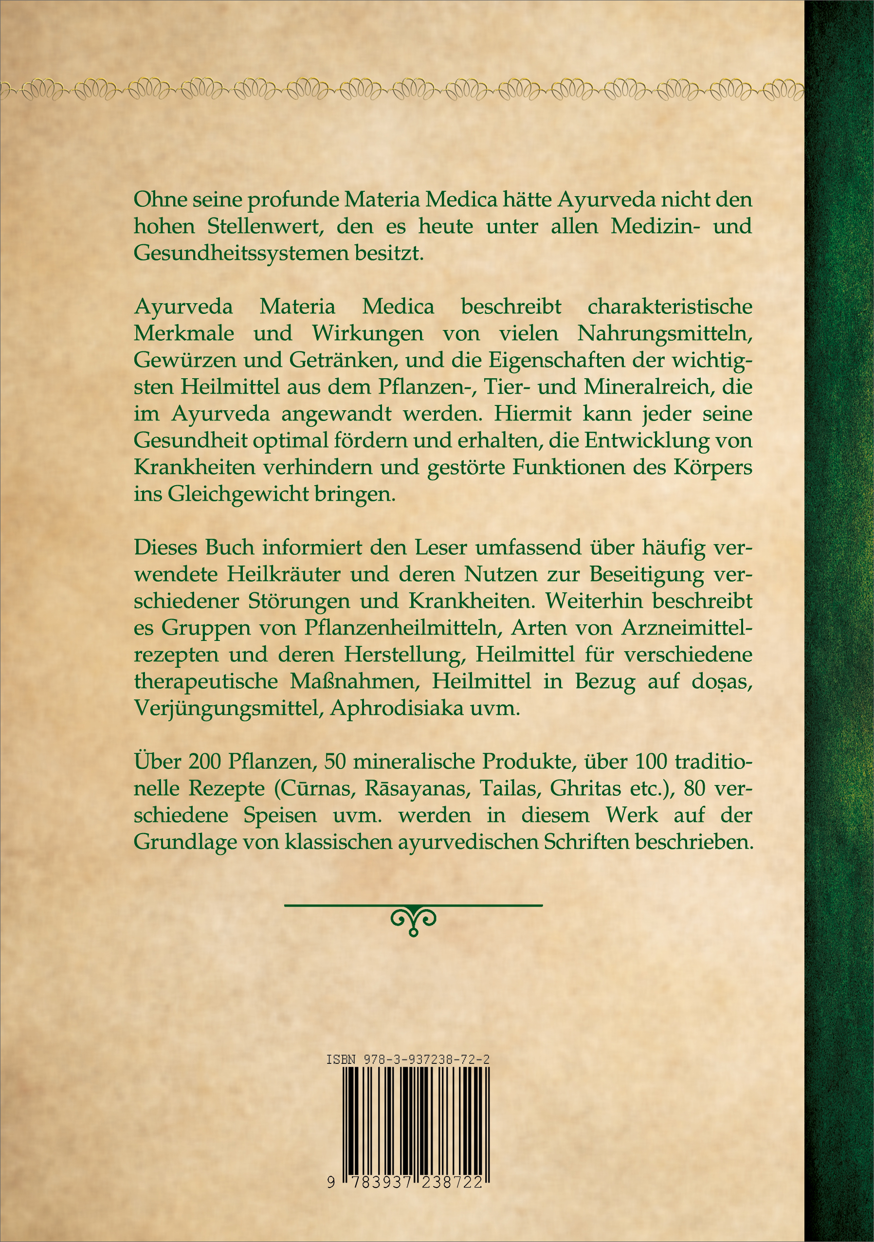 Ayurveda Materia Medica beschreibt charakteristische Merkmale und Wirkungen von vielen Nahrungsmitteln, Gewürzen und Getränken, und die Eigenschaften der wichtigsten Heilmittel aus dem Pflanzen-, Tier- und Mineralreich, die im Ayurveda angewandt werden. Hiermit kann jeder seine Gesundheit optimal fördern und erhalten, die Entwicklung von Krankheiten verhindern und gestörte Funktionen des Körpers ins Gleichgewicht bringen.