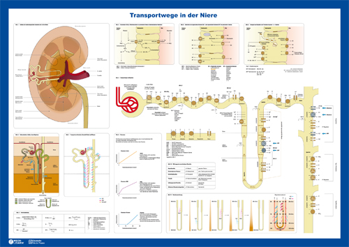 Dieses Poster fasst die komplizierte Thematik der vielfältigen Transportwege und Stoffwechselvorgänge in der menschlichen Niere in anschaulicher und übersichtlicher Form zusammen. Der Inhalt wurde auf den examens- und prüfungsrelevanten Umfang reduziert, damit du den Überblick nicht verlierst und dich auf das Wesentliche konzentrieren kannst.