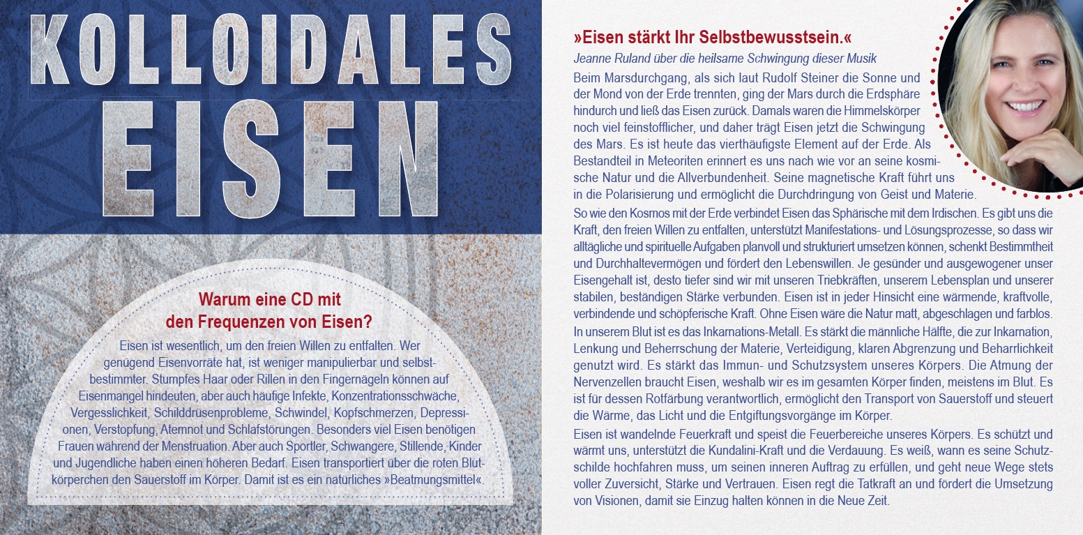 »Bei dieser Musik ging es darum, die heilende Kraft von Eisen in harmonische Klänge zu überführen und mit weiteren gesunden Frequenzen zu unterstützen. Nach mehreren Anläufen zeigte sich, dass nicht alle Frequenzen, die ich gerne integriert hätte, harmonisch zusammenpassten. Die Lösung bildete schließlich eine Art Triptychon. Ich entschied mich für drei Stücke, die durchgängig die kolloidale Schwingung von Eisen aufweisen, aber jeweils eine eigene zusätzliche Qualität besitzen. In das erste Stück konnte ich die Frequenz zur Erdung integrieren, 174 Hertz. Sie verleiht den Organen Sicherheit, weil sie die Energie ordnet, und bereitet den Hörerinnen und Hörern ein stabiles Fundament für die Entwicklung des Bewusstseins. Im zweiten Stück klingt neben dem Eisen die Quanteninformation der ursprünglichen Form und Energie der Gewebestrukturen mit, 285 Hertz, so dass die Anbindung an die natürliche Ordnung weiter verstärkt wird. Diese beiden errechneten Solfeggio-Frequenzen wurden im dritten Stück gekrönt durch die Liebesschwingung 528 Hertz, die in der Solfeggio-Tonleiter bereits enthalten war. Das Eisen schwingt hier im Einklang mit der Frequenz der DNA-Reparatur, was Kreativität und Bewusstsein anregt und auf dem Weg der Transformation viele Zeichen und Wunder erwarten lässt. So kommt die Hörerin oder der Hörer in den Genuss einer Abfolge von drei Musikstücken, die ihn zuerst erden, dann über die Wundheilung auch das Energiefeld stärken und schließlich durch den Zustrom von Liebe das Immunsystem optimal verbessern.«