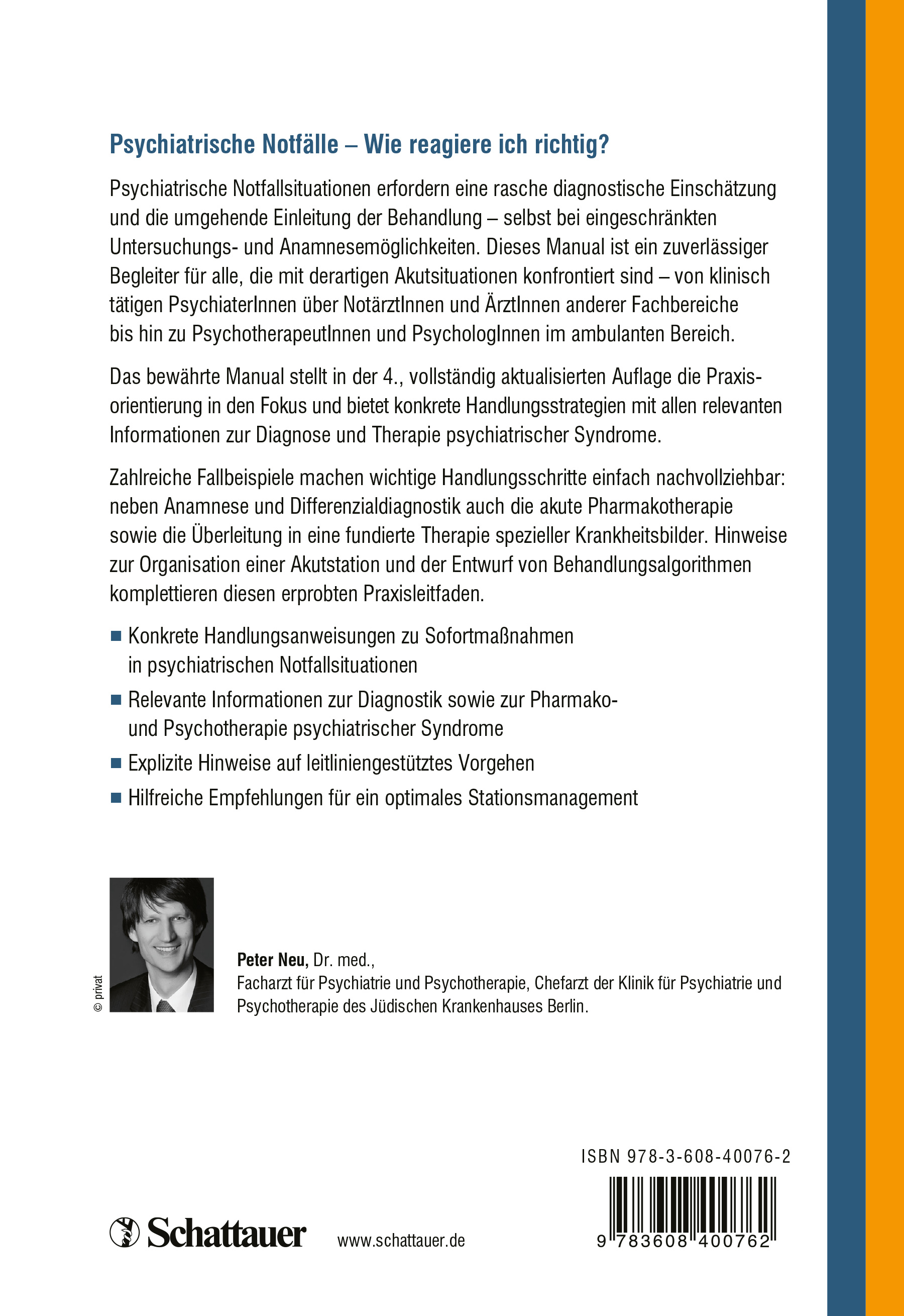 Psychiatrische Notfallsituationen erfordern eine rasche diagnostische Einschätzung und die umgehende Einleitung der Behandlung – selbst bei eingeschränkten Untersuchungs- und Anamnesemöglichkeiten. Dieses Manual ist ein zuverlässiger Begleiter für alle, die mit derartigen Akutsituationen konfrontiert sind – vom klinisch tätigen Psychiater über Notärzte und Ärzte anderer Fachbereiche bis hin zu Psychotherapeuten und Psychologen im ambulanten Bereich.