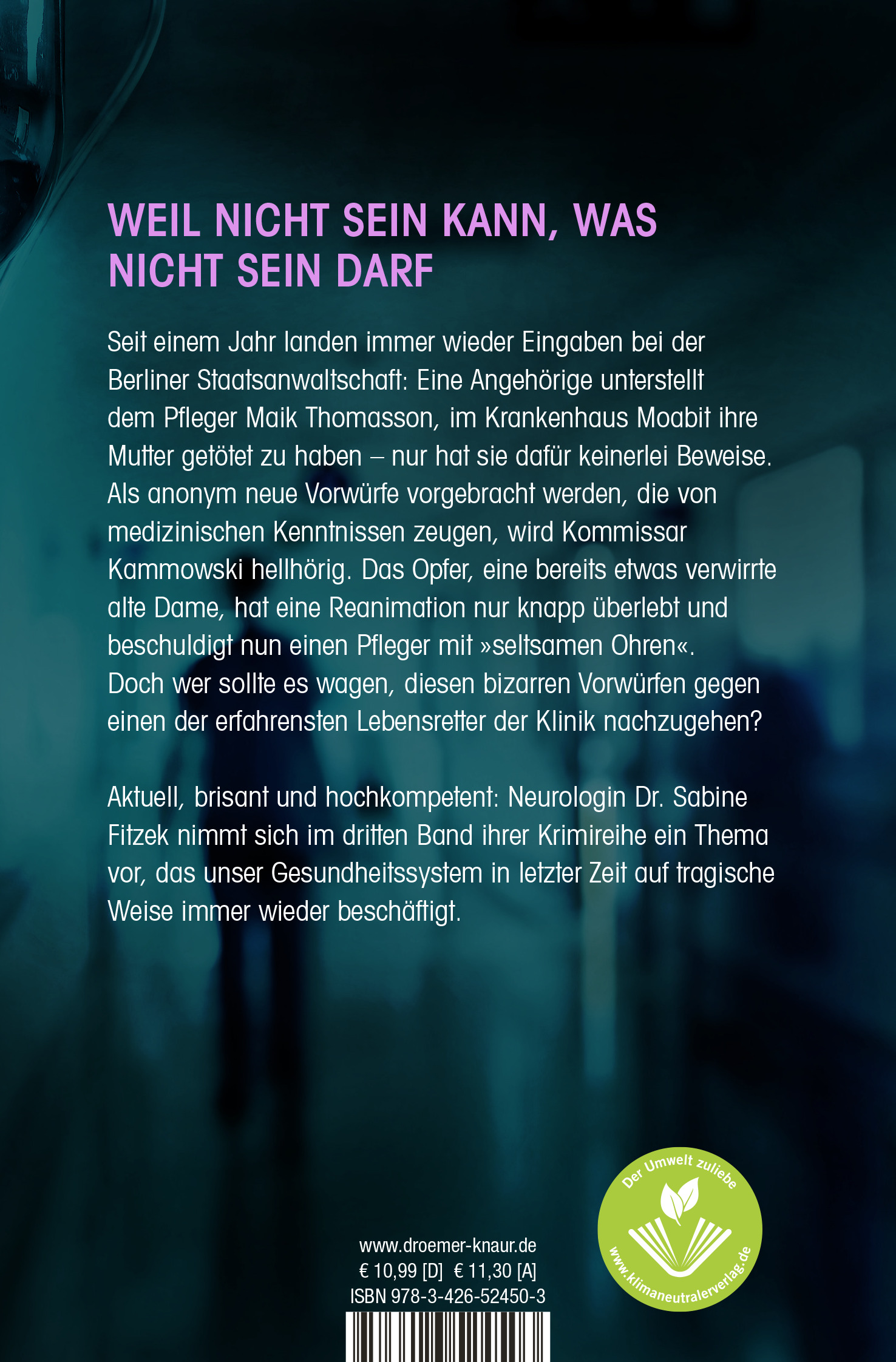 Wenn Leben nimmt, wer Leben retten soll: Im dritten Teil der Medizin-Krimi-Reihe von Dr. Sabine Fitzek ermittelt der Berliner Kommissar Kammowski im Krankenhaus Moabit. Aktuell, brisant und hochkompetent: Dr. Sabine Fitzek ist Neurologin und hat 10 Jahre als Chefärztin gearbeitet. In ihrer Krimi-Reihe setzt sie sich spannend und informativ zugleich mit den Missständen in unserem Gesundheitssystem auseinander.