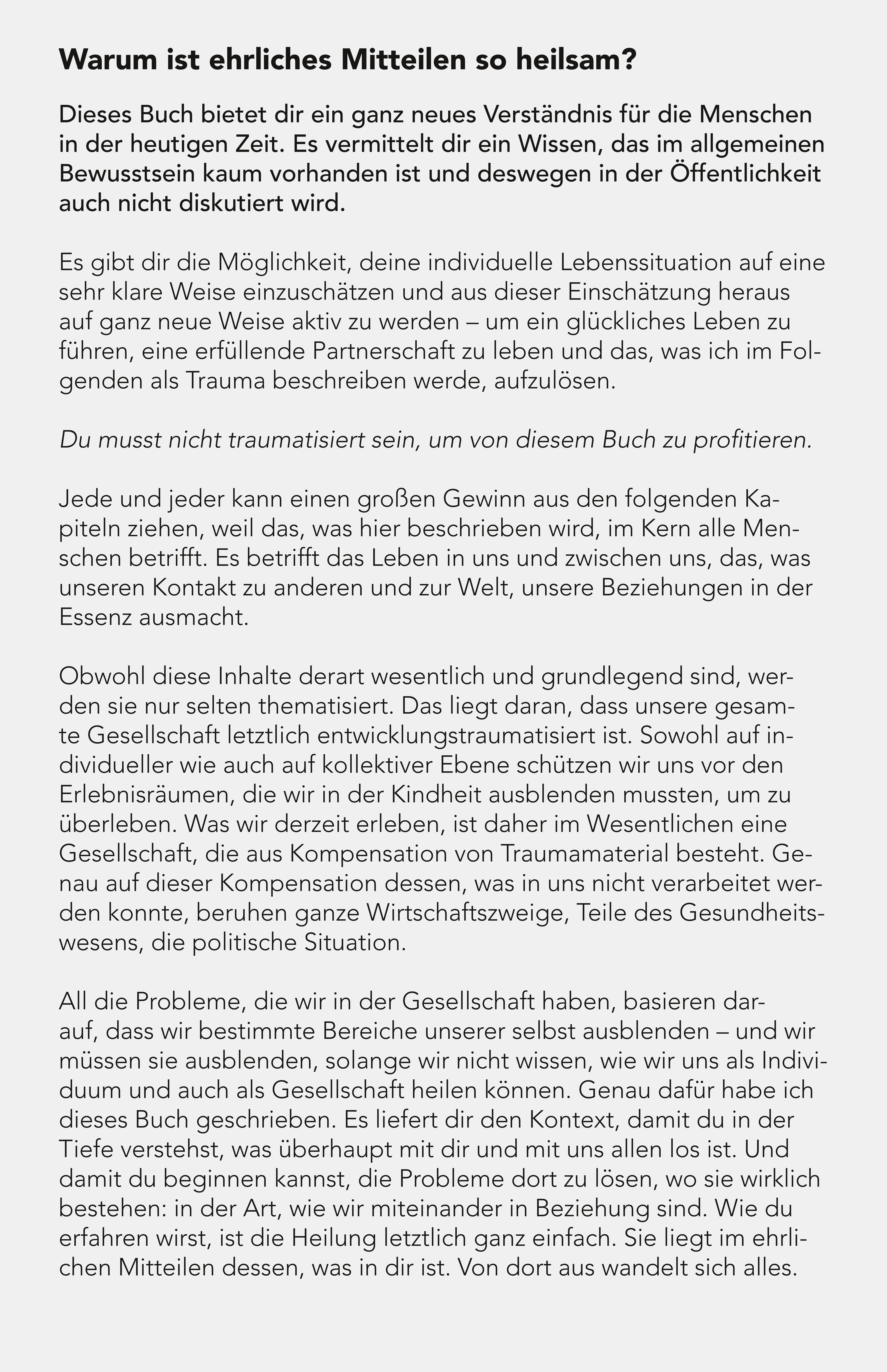 Fast jeder Mensch ist heute von Bindungs- und Entwicklungstrauma betroffen. Diese erschreckende Erkenntnis führte den bekannten Traumatherapeuten Gopal Norbert Klein zu einer einfachen, höchst wirksamen Heilmethode, dem »Ehrlichen Mitteilen«: Wir teilen anderen in einem sicheren Rahmen ungefiltert mit, was in uns wahrnehmbar ist.