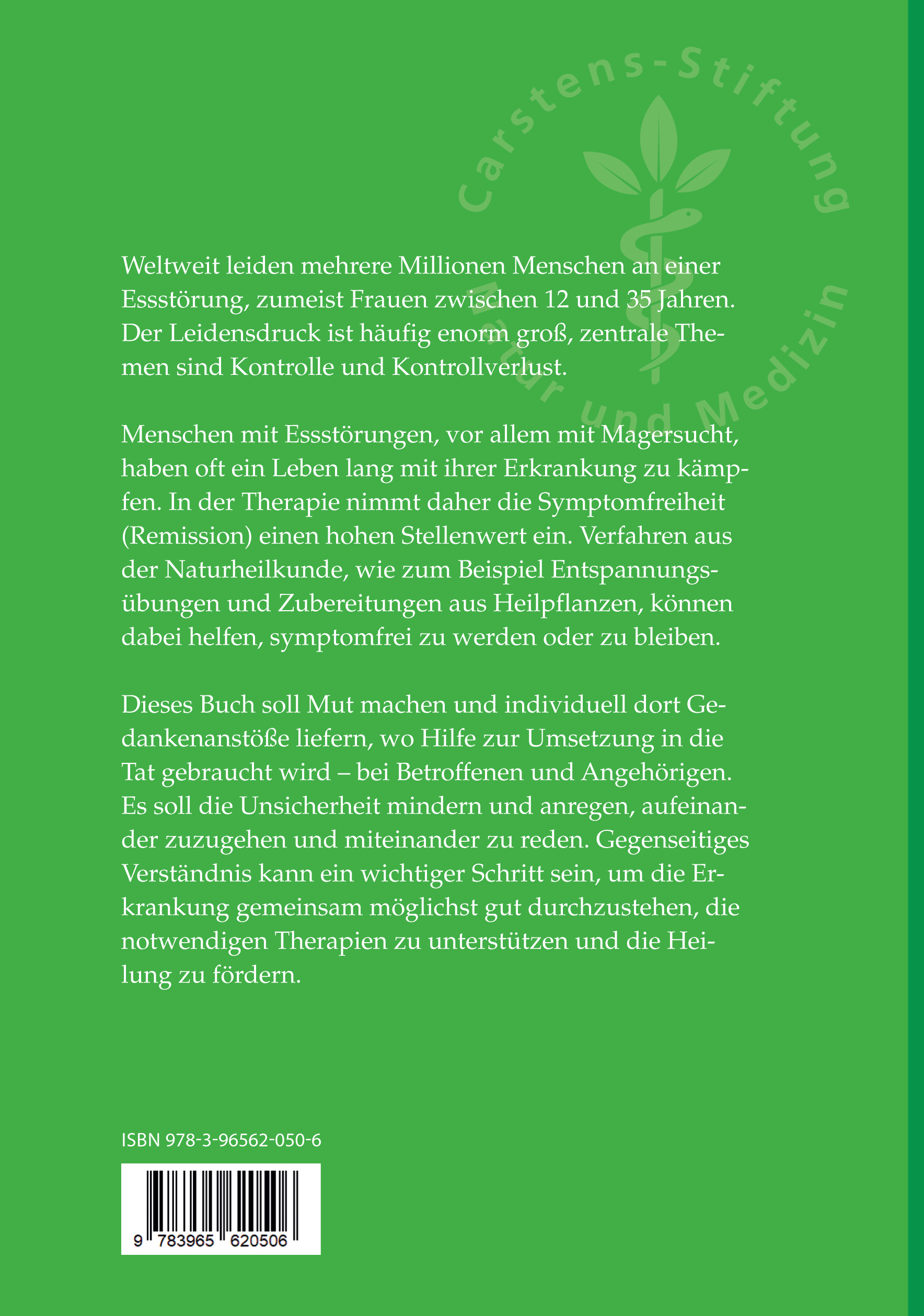Weltweit leiden mehrere Millionen Menschen an einer Essstörung, zumeist Frauen zwischen 12 und 35 Jahren. Der Leidensdruck ist häufig enorm groß, zentrale Themen sind Kontrolle und Kontrollverlust. Menschen mit Essstörungen, vor allem mit Magersucht, haben oft ein Leben lang mit ihrer Erkrankung zu kämpfen. In der Therapie nimmt daher die Symptomfreiheit (Remission) einen hohen Stellenwert ein. Verfahren aus der Naturheilkunde, wie zum Beispiel Entspannungsübungen und Zubereitungen aus Heilpflanzen, können dabei helfen, symptomfrei zu werden oder zu bleiben.Dieses Buch soll Mut machen und individuell dort Gedankenanstöße liefern, wo Hilfe zur Umsetzung in die Tat gebraucht wird - bei Betroffenen und Angehörigen. Es soll die Unsicherheit mindern und anregen, aufeinander zuzugehen und miteinander zu reden. Gegenseitiges Verständnis kann ein wichtiger Schritt sein, um die Erkrankung gemeinsam möglichst gut durchzustehen, die notwendigen Therapien zu unterstützen und die Heilung zu fördern.