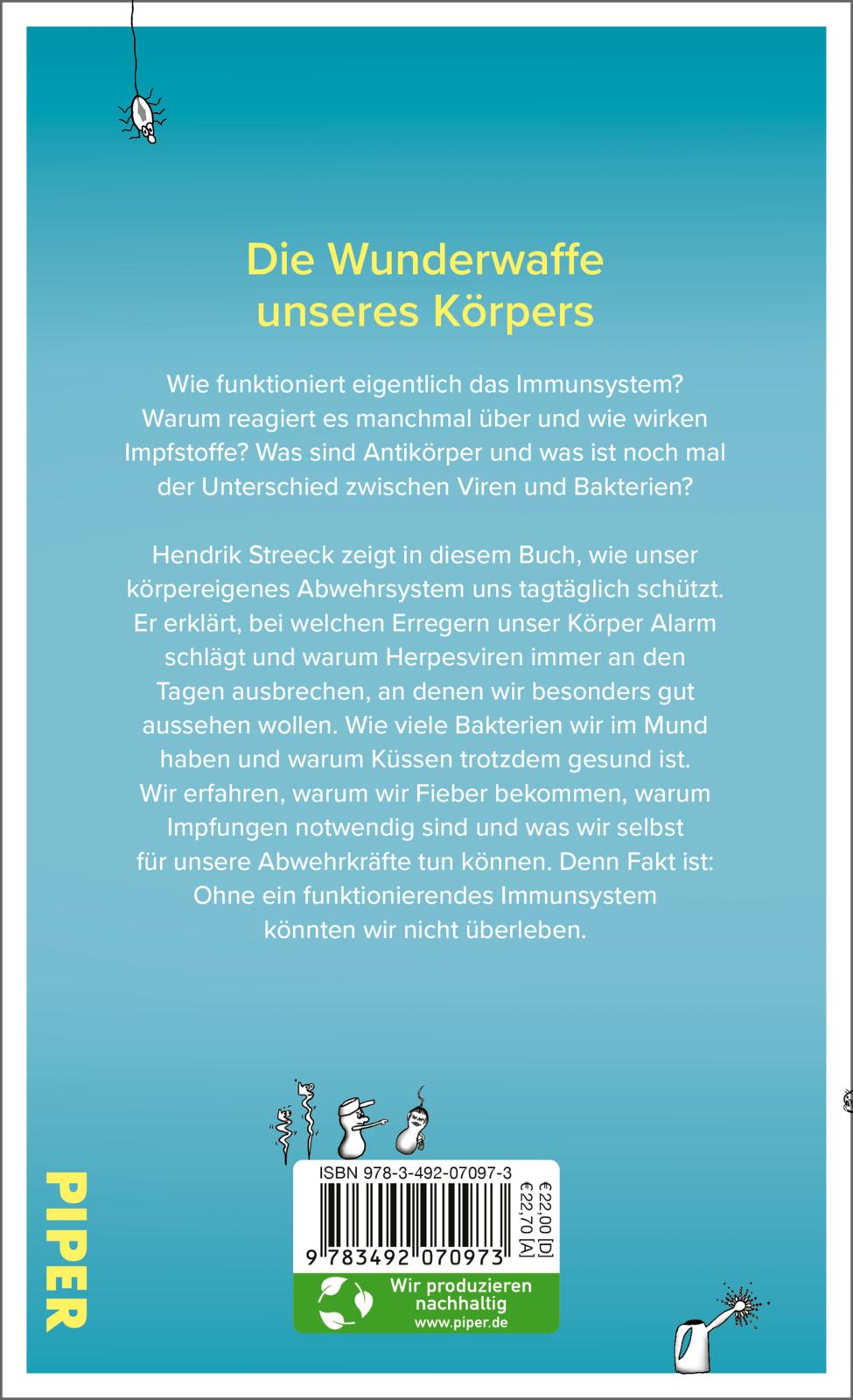 Hendrik Streeck beleuchtet unser Immunsystem wissenschaftlich fundiert und allgemeinverständlich. Er erklärt, bei welchen Erregern unser Körper Alarm schlägt und warum Herpesviren immer an den Tagen ausbrechen, an denen wir besonders gut aussehen wollen. Wie viele Bakterien wir im Mund haben und warum Küssen trotzdem gesund macht. Er zeigt, warum wir Fieber bekommen, warum Impfungen notwendig sind und was wir selbst für unsere Körperabwehr tun können. Denn Fakt ist: Ohne ein funktionierendes Immunsystem könnten wir nicht überleben.