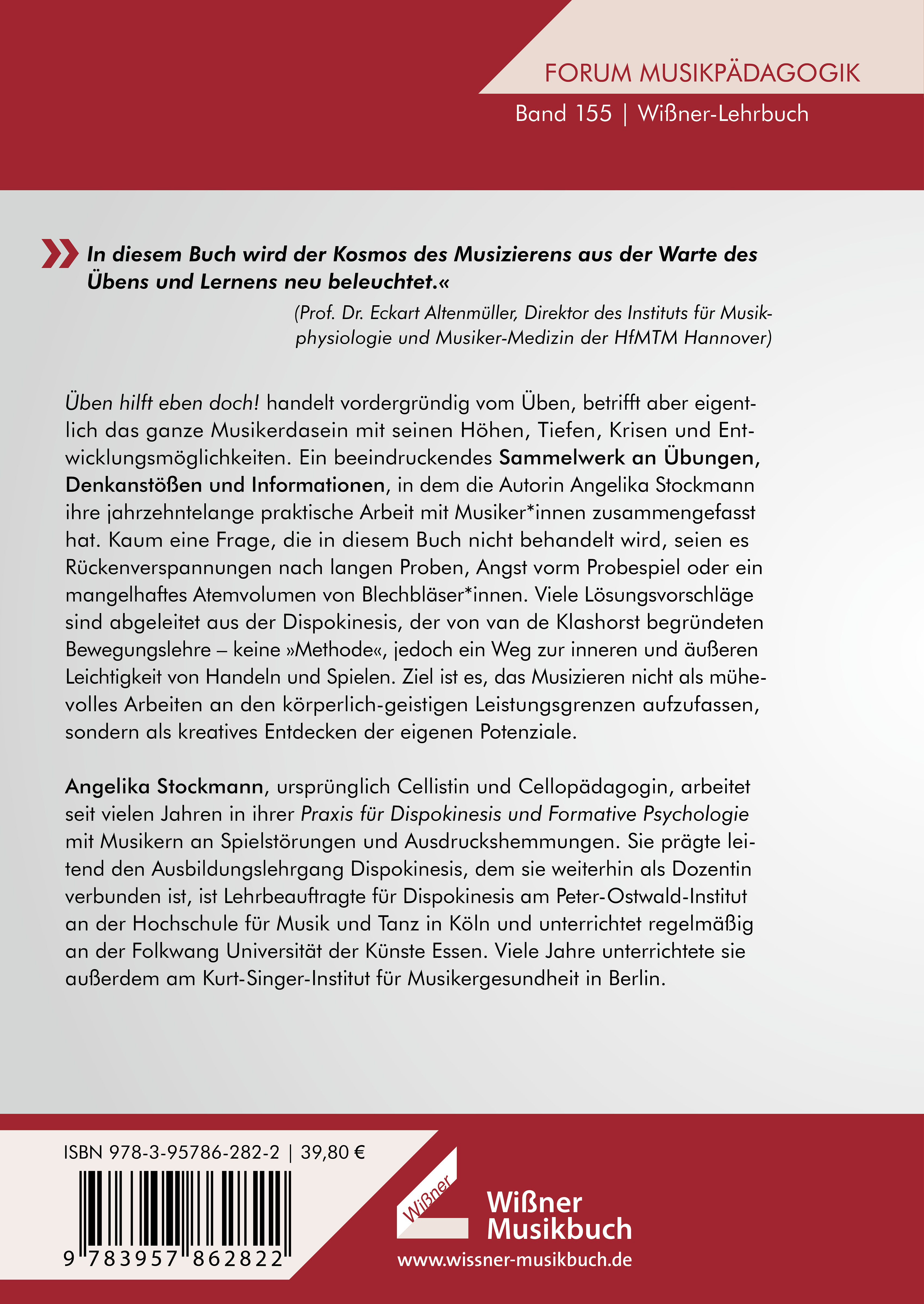 "Üben hilft eben doch!" handelt vordergründig vom Üben, betrifft aber eigentlich das ganze Musikerdasein mit seinen Höhen, Tiefen, Krisen und Entwicklungsmöglichkeiten. Ein beeindruckendes Sammelwerk an Übungen, Denkanstößen und Informationen, in dem die Autorin Angelika Stockmann ihre jahrzehntelange praktische Arbeit mit Musiker*innen zusammengefasst hat. Kaum eine Frage, die in diesem Buch nicht behandelt wird, seien es Rückenverspannungen nach langen Proben, Angst vorm Probespiel oder ein mangelhaftes Atemvolumen von Blechbläser*innen. Viele Lösungsvorschläge sind abgeleitet aus der Dispokinesis, der von van de Klashorst begründeten Bewegungslehre – keine "Methode", jedoch ein Weg zur inneren und äußeren Leichtigkeit von Handeln und Spielen. Ziel ist es, das Musizieren nicht als mühevolles Arbeiten an den körperlich-geistigen Leistungsgrenzen aufzufassen, sondern als kreatives Entdecken der eigenen Potenziale.
