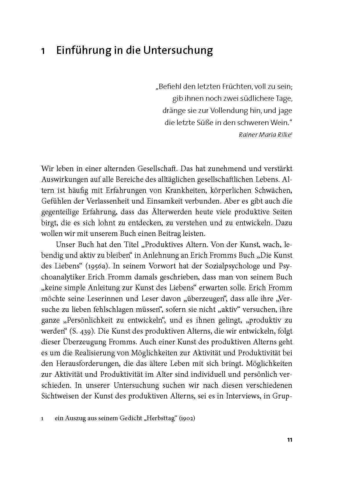 Für viele Menschen ist das Älterwerden nicht angenehm. Sie erleben es als eine Zeit der Einschränkung, der Entbehrung und des Verlustes. Man scheidet aus dem Beruf aus, verliert geliebte Menschen und muss mit Krankheiten leben. Es ist eine Kunst, produktiv zu bleiben und das Altern wach, lebendig und aktiv zu gestalten. Wie ältere Menschen das in ihren verschiedenen Lebensverhältnissen umsetzen - sei es in Seniorenheimen, im Betreuten Wohnen, in eigenen Wohnungen, alleine oder gemeinsam -, davon berichtet diese sozialpsychologische Untersuchung.