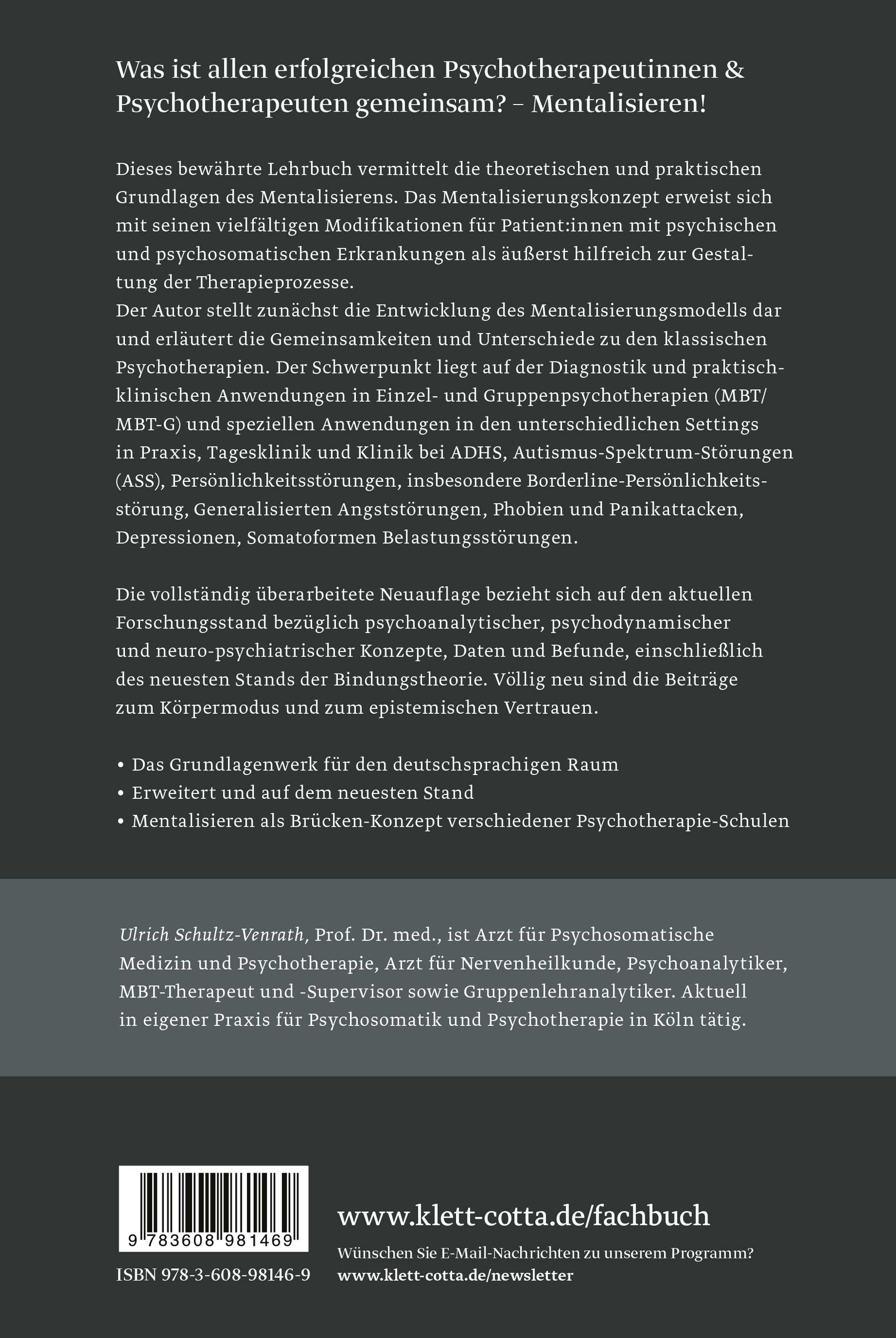 Dieses bewährte Lehrbuch vermittelt die theoretischen und praktischen Grundlagen des Mentalisierungskonzepts. Mentalisieren erweist sich für die Behandlung von Patientinnen und Patienten mit psychischen und psychosomatischen Störungen über verschiedene Schulrichtungen hinweg als äußerst hilfreiches Hilfsmittel der erfolgreichen Gestaltung therapeutischer Prozesse. Der Autor stellt das Mentalisierungsmodell dar und erläutert es mit Hilfe aktueller psychoanalytischer, neurowissenschaftlicher und neuro-psychiatrischer Konzepte, Daten und Befunde. Auf dieser Grundlage werden praktisch-klinische Anwendungen beschrieben bei: