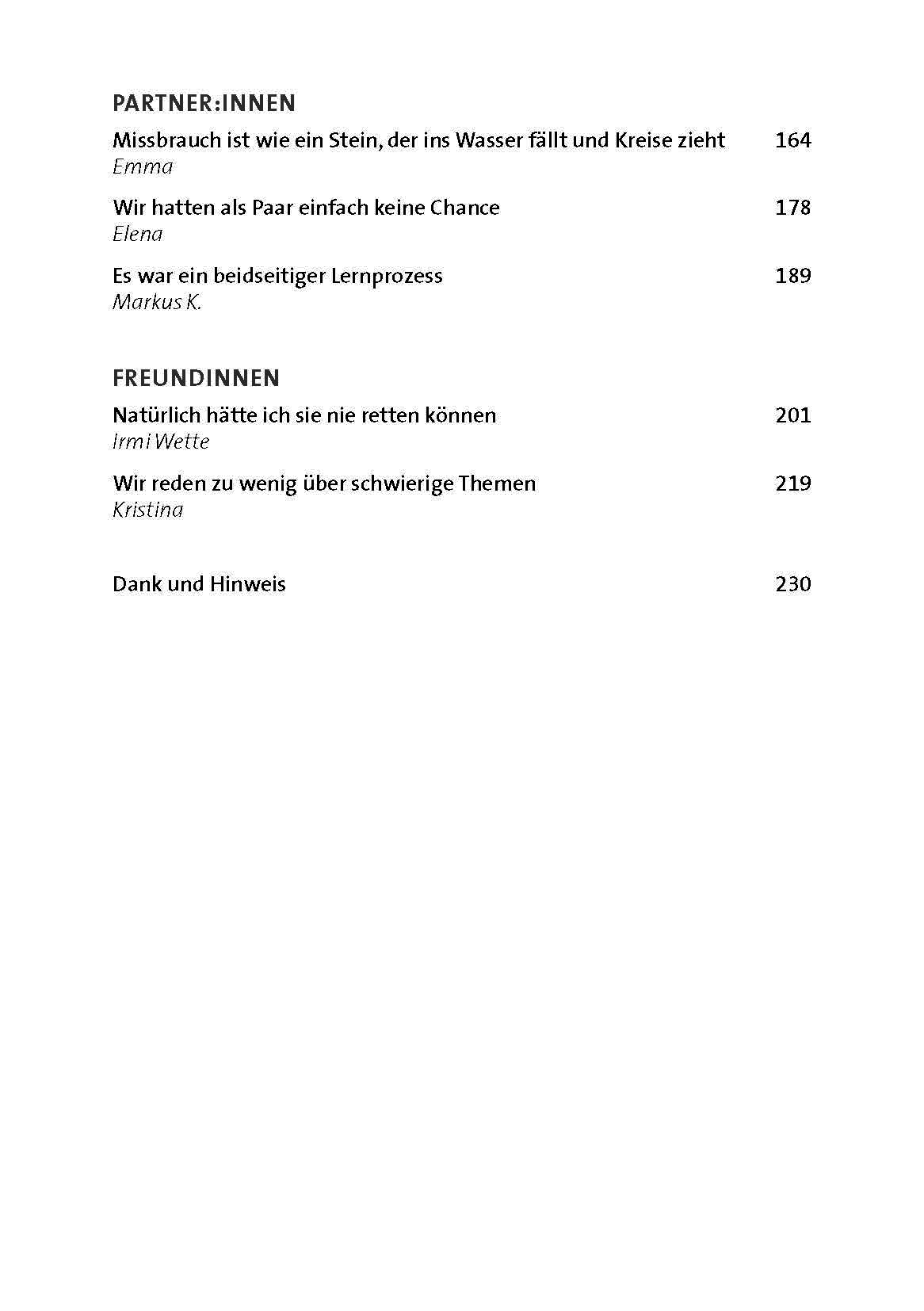 Sexualisierte Gewalt in Kindheit und Jugend hat nicht nur Folgen für die Betroffenen. Sie wirkt sich – spätestens nach der Offenlegung – auch unmittelbar auf das Leben von Eltern, Geschwistern und anderen Bezugspersonen aus. Im Gespräch mit der Autorin erzählen Angehörige von den teilweise dramatischen Folgen für sie, mit welchen Strategien ihr Vertrauen gezielt erschlichen wurde und wo sie an Grenzen stießen – auch im Willen, den Missbrauch umfassend aufzuklären. Sie spüren ihrem schlechten Gewissen nach, den Missbrauch nicht verhindert zu haben oder stellen sich die Frage, warum es scheinbar leichter ist, die Schuld bei sich selbst als bei den Täter:innen zu suchen. Sie erzählen, wie es ihnen im Gespräch mit den Betroffenen gelungen ist, eine wertvolle Stütze zu sein, die eigene Betroffenheit zu verarbeiten und manchmal auch in gesellschaftliches Engagement umzusetzen.