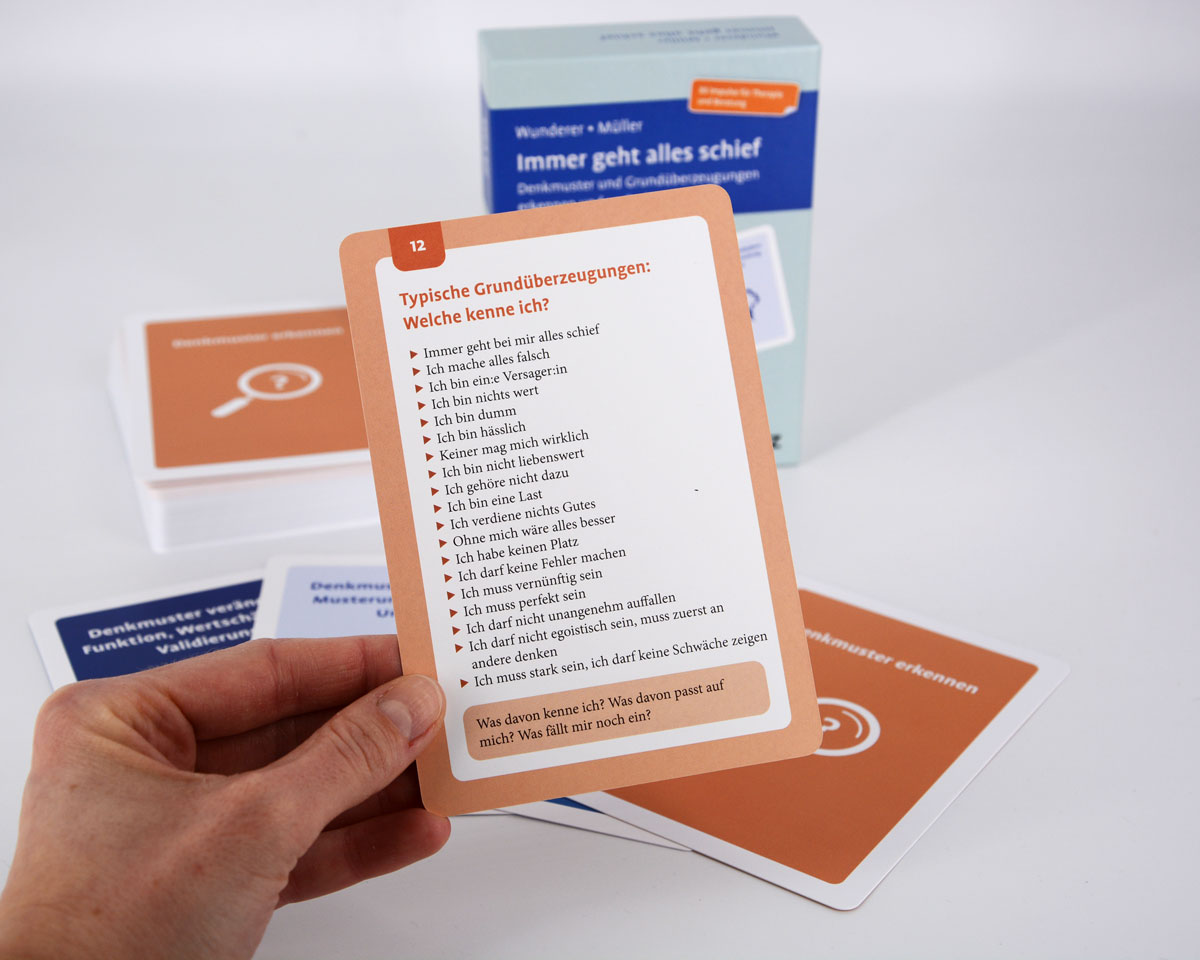 »Immer geht alles schief« oder »Ich bin an allem schuld« – solche Denkmuster oder Grundüberzeugungen finden sich bei vielen Klient_innen in Psychotherapie und Beratung. Sie sehen und interpretieren weite Teile ihres Lebens schwarz und bestätigen sich immer wieder in dieser Auffassung. Hier liegt ein wesentlicher Ansatzpunkt für Veränderungen im therapeutischen Prozess. Das Kartenset ermöglicht Klient_innen, eigene Denkmuster und Grundüberzeugungen aufzuspüren, zu hinterfragen und zu verändern. Die 88 Therapiekarten beinhalten validierende wie provokative Denkanstöße, relativierende Umformulierungen, Fantasiereisen und Übungen zur Musterunterbrechung aus unterschiedlichen Therapierichtungen (u.a. KVT, ACT, DBT, Ego State Therapie, Embodiment). Der Erforschung der individuellen Denkmuster widmen sich 22 Karten, 66 Karten fordern zum Umdenken auf. Die Karten sind geeignet für Psychotherapie, Beratung und (Soziale) Gruppenarbeit, zur Arbeit mit Klient_innen, aber auch zur Selbstreflexion der Behandelnden.