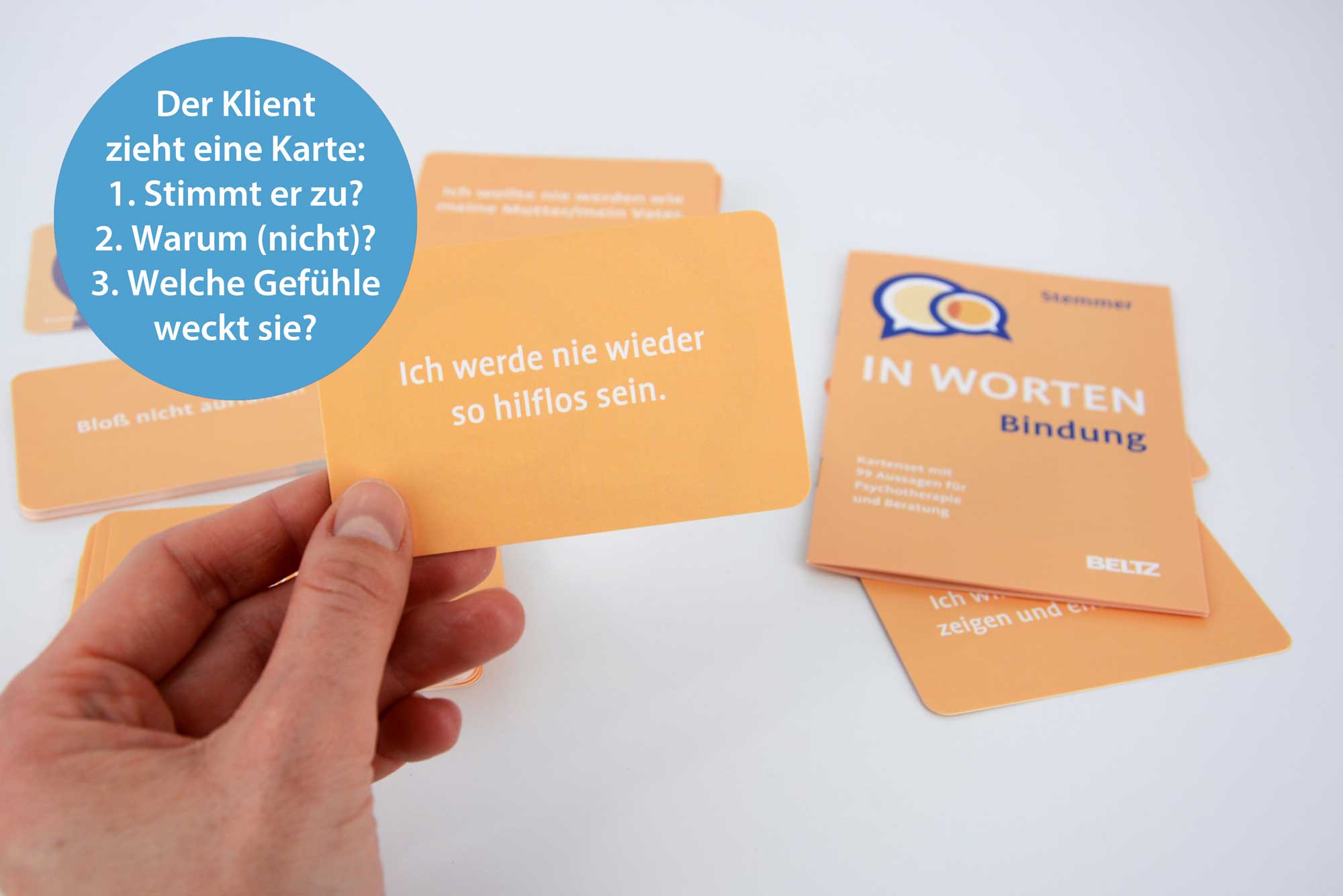 In Psychotherapie, Beratung und Coaching basiert vieles auf dem gesprochenen Wort: Fragen stellen, Antworten geben, Gedanken aussprechen, Werte, Ziele, Veränderungswege formulieren, Situationen beschreiben etc. Worte haben eine große Wirkung und werden ganz bewusst eingesetzt. Die neue Reihe »In Worten« nutzt diese Tatsache und bietet Kartensets mit vielfältigen Aussagen zu unterschiedlichen Themen. Es sind Aussagen oder Kognitionen aus der alltäglichen Lebenswelt, Sprichworte oder Allgemeinplätze, die jeweils in einem Set ein Thema aufarbeiten. Die Arbeit mit den Aussagen hilft dabei, ein Thema in seiner Bedeutung für die Klient_innen und damit für die Behandlungsplanung zu erschließen. Die Karten sind im Einzel- sowie im Gruppensetting und bei Erwachsenen und Jugendlichen einsetzbar. Sie bieten viele Anwendungsvarianten und verhelfen zu individuellen Therapieelementen.»Bindung« beeinflusst auf der Grundlage früher Erfahrungen die Gestaltung von Beziehungen, besonders in Familie, Freundschaften oder intimen Verbindungen. Der Bindungsstil prägt unbewusst Erwartungen an Andere sowie Kontaktmuster und beeinflusst die Balance zwischen Exploration und Nähe. Erfolgreiche Psychotherapie erfordert ein Verständnis des Bindungsthemas der Patient*innen und ein bewusstes und explizites Arbeiten damit. Die 99 Aussagen erleichtern es, darüber ins Gespräch zu kommen.