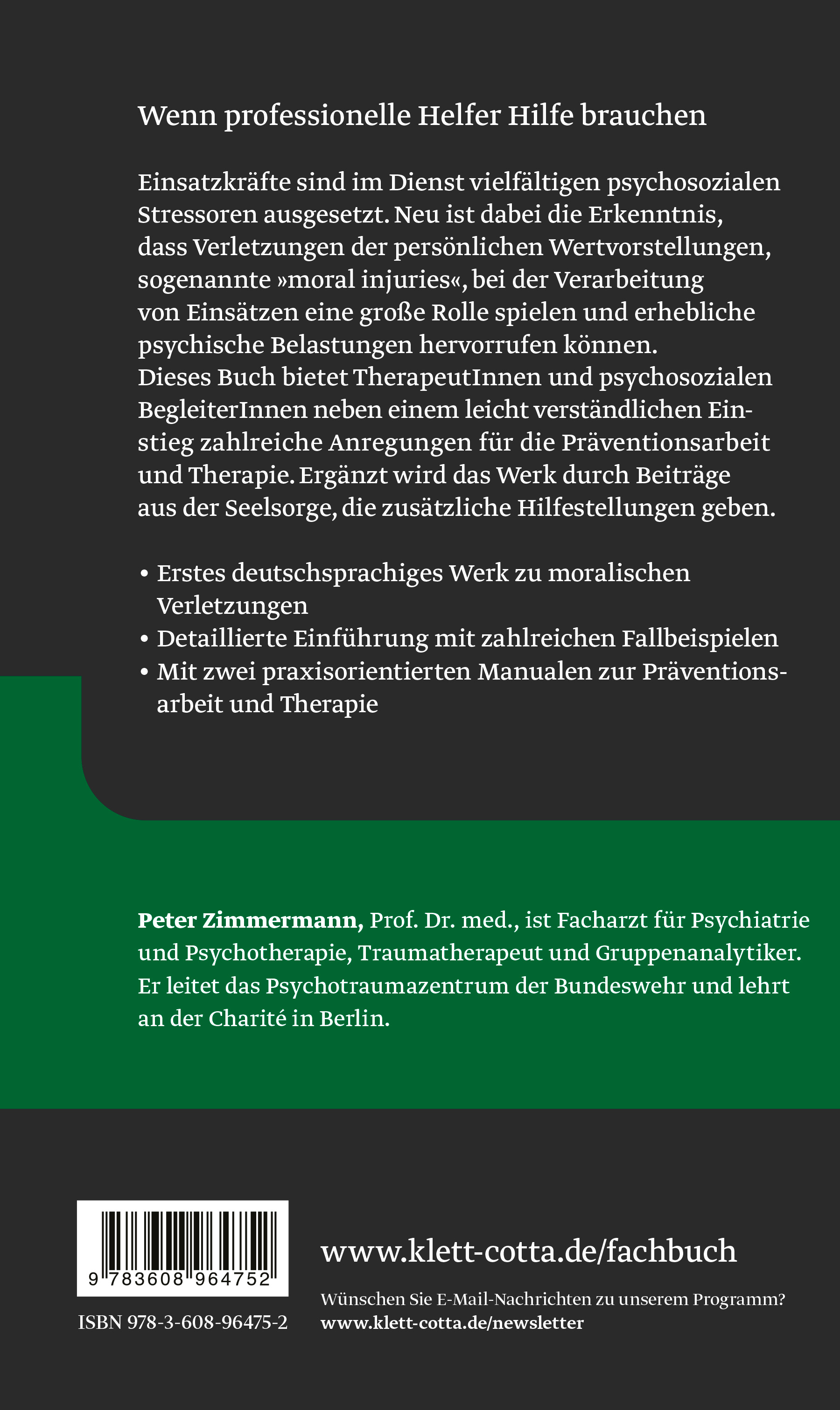 | Schlagworte | Krisenintervention • Moral injuries • moral injury • Moralische Konflikte • moralische Verletzungen • Posttraumatische Belastungsstörung • Präventionsmanual • Psychologie • Psychosoziale Notfallversorgung • Psychosoziale Versorgung von Einsatzkräften • Psychotherapie • Psychotraumatologie • PTBS • Therapiemanual • Trauma • Traumatherapie • Traumatherapie bei Einsatzkräften • Wertorientierung |