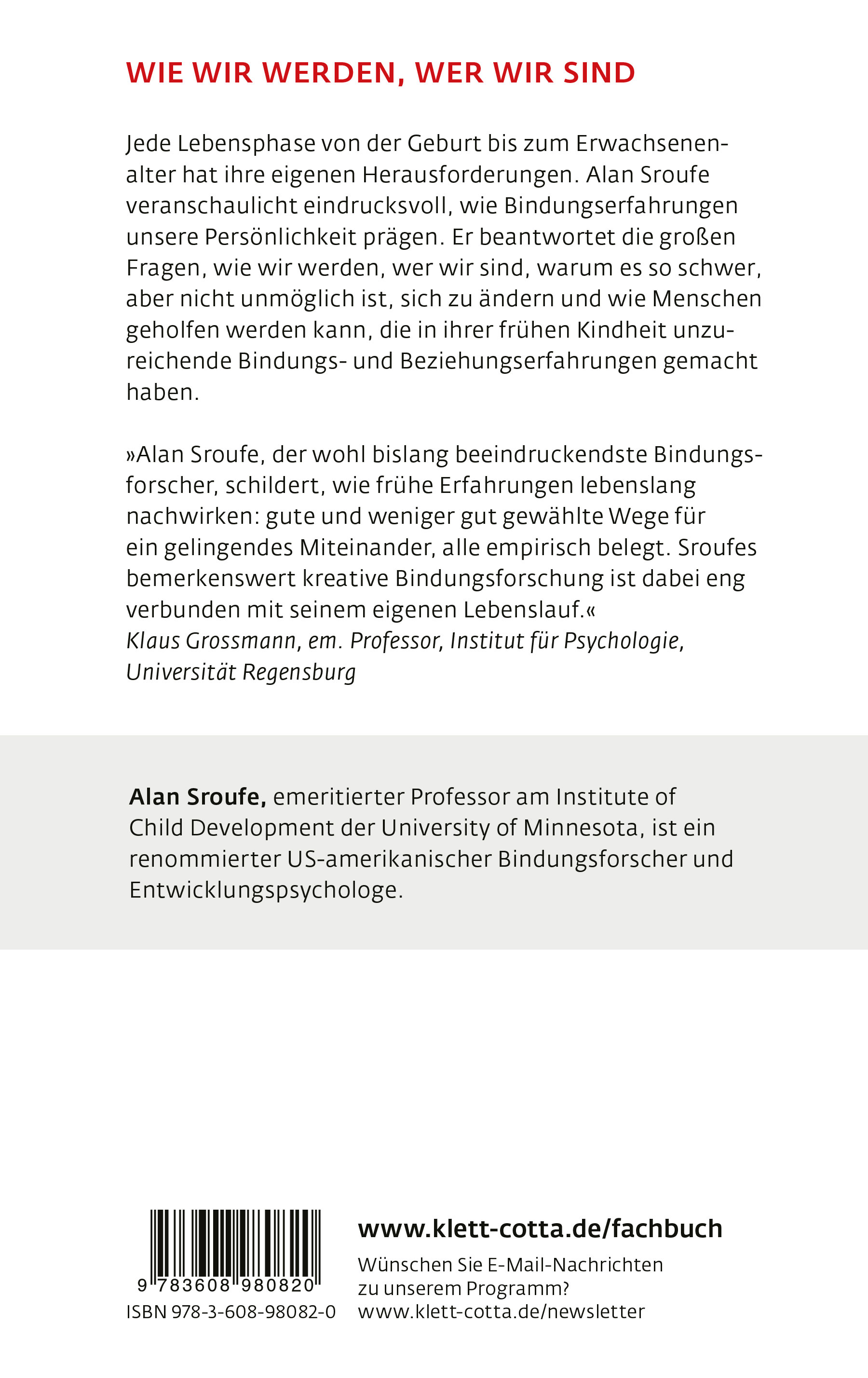 Jede Lebensphase von der Geburt bis zum Erwachsenenalter hat ihre eigenen Herausforderungen und Konfliktfelder. Alan Sroufe, einer der weltweit bedeutendsten Entwicklungspsychologen, veranschaulicht eindrucksvoll wie Bindungserfahrungen lebenslang nachwirken und die Persönlichkeit prägen. Er stellt seine wegweisenden wissenschaftlichen Erkenntnisse zu Bindung und Entwicklung immer in Bezug zu seiner eigenen persönlichen Entwicklung, was dieses Buch zu einer höchst spannenden und eindrucksvollen Lektüre macht. Sroufe beantwortet in seinem Werk die großen Fragen, wie wir werden, wer wir sind, warum es so schwer - aber nicht unmöglich ist - sich zu ändern und wie Menschen geholfen werden kann, die in ihrer frühen Kindheit unzureichende Bindungs- und Beziehungserfahrungen gemacht haben.