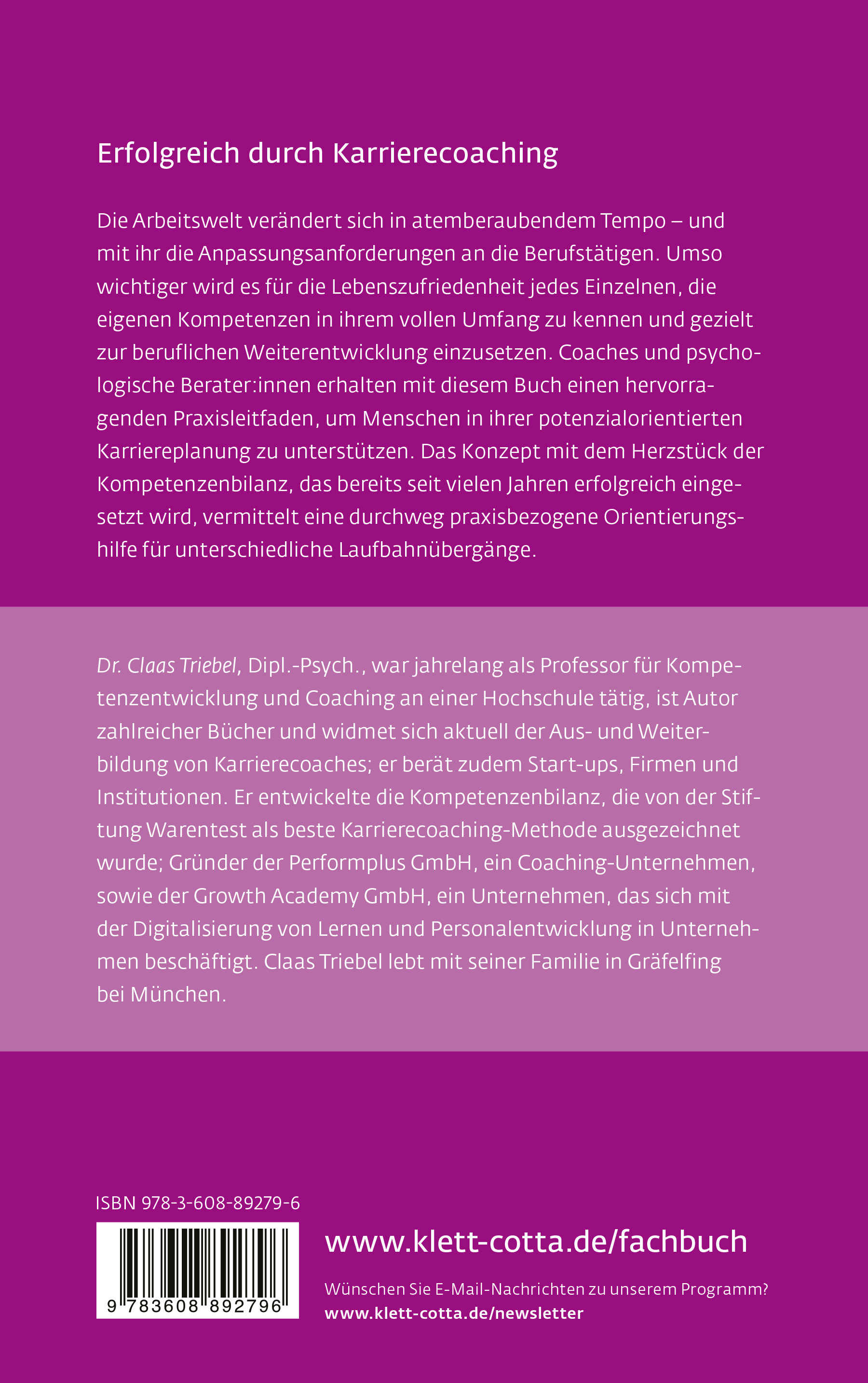Dr. Claas Triebel, Dipl.-Psych., war jahrelang als Professor für Kompetenzentwicklung und Coaching an einer Hochschule tätig, ist Autor zahlreicher Bücher und widmet sich aktuell der Aus- und Weiterbildung von Karrierecoaches; er berät zudem Startups, Firmen und Institutionen. Er entwickelte die Kompetenzenbilanz, die von der Stiftung Warentest als beste Karrierecoaching-Methode ausgezeichnet wurde; Gründer der Performplus GmbH, ein Coaching-Unternehmen, sowie der Growth Academy GmbH, ein Unternehmen, das sich mit der Digitalisierung von Lernen und Personalentwicklung in Unternehmen beschäftigt. Claas Triebel lebt mit seiner Familie in Gräfelfing bei München.