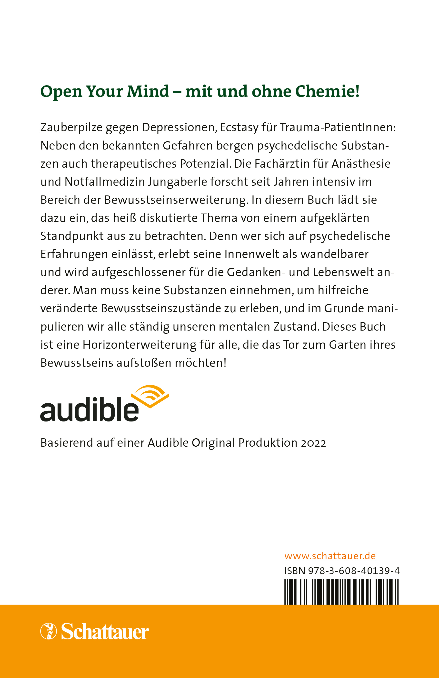 Die Fachärztin für Anästhesie und Notfallmedizin Andrea Jungaberle forscht seit Jahren intensiv zum Thema Bewusstseinserweiterung - mit und ohne Moleküle. In diesem Buch lädt sie dazu ein, dieses heiß diskutierte Thema von einem aufgeklärten Standpunkt aus zu betrachten. Denn wer sich auf psychedelische Erfahrungen einlässt, erlebt seine Innenwelt als wandelbarer und wird so auch aufgeschlossener für die Gedanken- und Lebenswelt anderer Menschen.