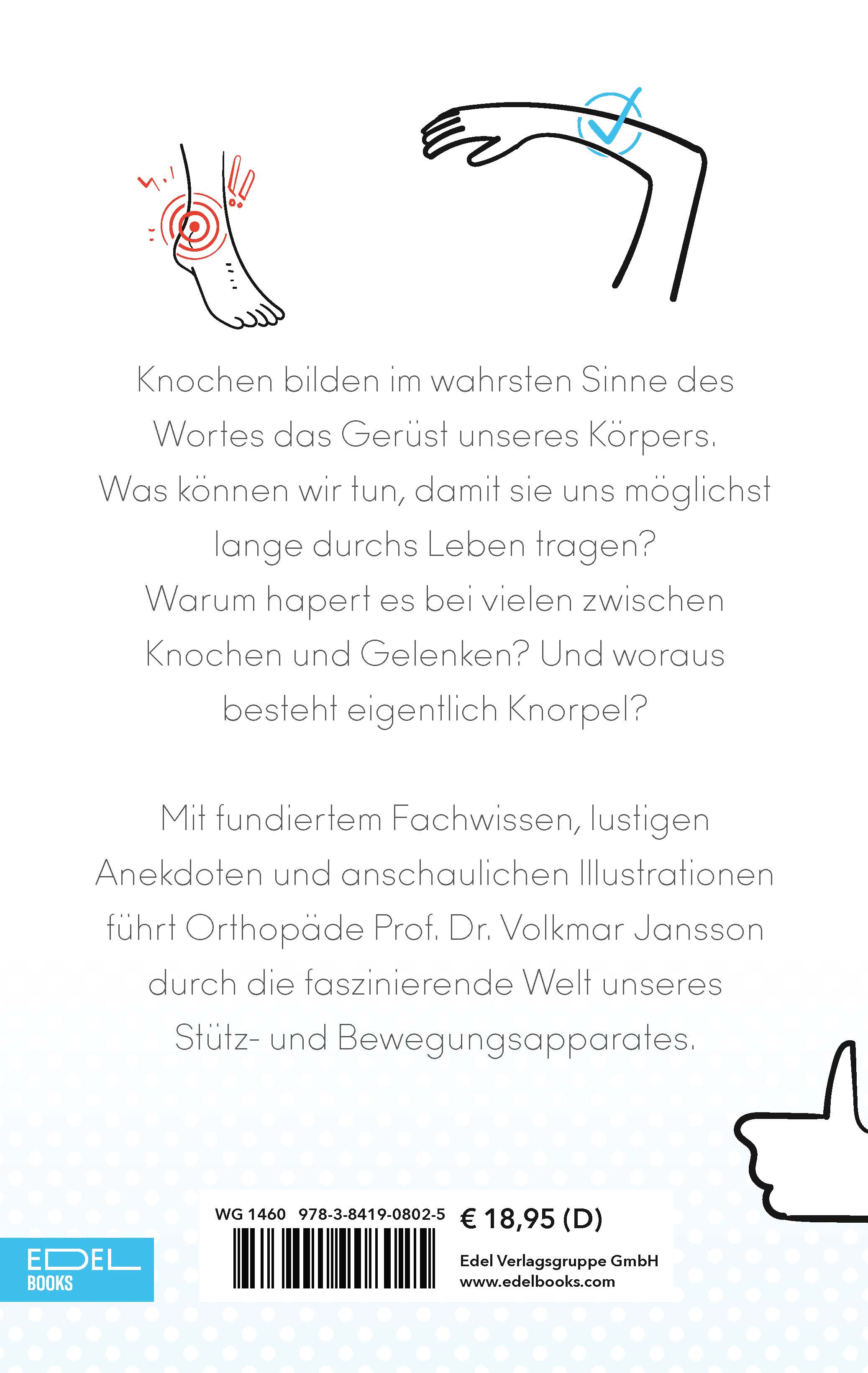 Mit »Happy Bones« legt Orthopäde und Knochenexperte Prof. Dr. Jansson ein abwechslungsreiches Lesebuch über Knochen und Gelenke vor, das alles Wissenswerte zum Thema umfasst. So sind unsere Stütz- und Bewegungsstrukturen nicht nur ausgetüftelte Konstruktionen, sondern auch medizin- und kulturhistorisch interessant. Begleitet werden die informativen und unterhaltsamen Texte von Abbildungen und konkreten Ratschlägen für jedes Alter sowie von gezielten Übungen für starke Muskeln und Knochen. »Happy Bones« informiert über die wichtigsten Krankheitsbilder von Frozen Shoulder über die Kniegelenksarthrose bis zur Osteoporose inklusive Hintergrundwissen zu Knochenmark, Knorpel und Co. Kleine »Knochenfeuilletons« lockern das ganz und gar nicht knochentrockene Thema auf, ebenso Infokästen zu Hyaluron, Mineralien, Vitamin D und vielem mehr. Mit Unterstützung der Co-Autorin und Medizinjournalistin Bettina Rubow ist das Buch eine informative Motivation für jede*n, sich rechtzeitig um die eigenen Knochen und Gelenke zu kümmern. Abgerundet von konkreten Handlungstipps in Richtung Bewegung und Ernährung sowie Erläuterungen dazu, wie man mit Gelenkverschleiß und anderen Problemen umgeht, und zusätzlich garniert mit informativen Knochen-Cartoons, erdacht vom Professor selbst.