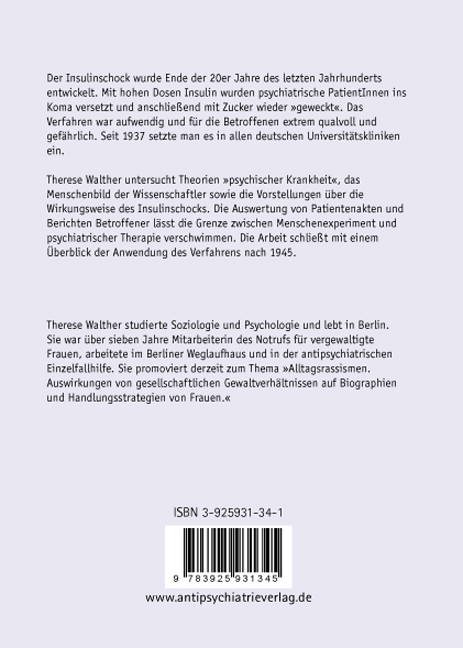 Der Insulinschock wurde Ende der 1920er-Jahre entwickelt. Mit hohen Dosen Insulin wurden psychiatrische PatientInnen ins Koma versetzt und anschließend mit Zucker wieder "geweckt". Das Verfahren war aufwendig und für die Betroffenen extrem qualvoll und gefährlich. 1937 setzte man es in allen deutschen Universitätskliniken ein. Therese Walther untersucht Theorien "psychischer Krankheit", das Menschenbild der Wissenschaftler sowie die Vorstellungen über die Wirkungsweise des Insulinschocks. Die Auswertung von Patientenakten und Berichten Betroffener läßt die Grenze zwischen Menschenexperiment und psychiatrischer Therapie verschwimmen. Die Arbeit schließt mit einem Überblick der Anwendung des Verfahrens nach 1945.