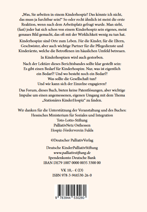 Das Forum, dieses Buch, bieten keine Patentlösungen, aber wichtige Impulse um einen angemessenen, eigenen Umgang mit dem Thema „Stationäres KinderHospiz“ zu finden.