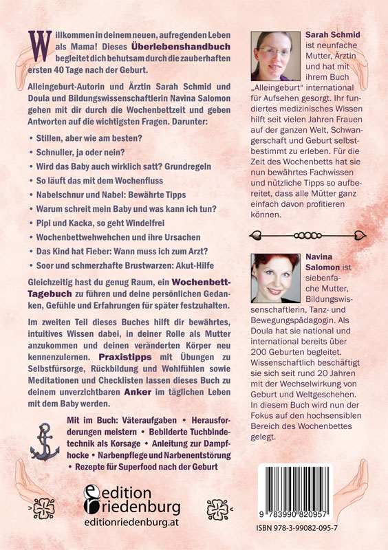 Teil 1: Hier findest du Raum für Erinnerungen an die Zeit nach der Geburt, Tagebuchseiten für die ersten 12 Wochen, die wichtigsten Themen im Wochenbett aus Sicht zweier erfahrener Mütter: eine davon Bildungswissenschaftlerin, Doula, Tanz- und Bewegungspädagogin, die andere Ärztin. *** Willkommen ... in deinem neuen Leben als Mama! Endlich hältst du im Arm, worauf du monatelang gewartet hast: Dein Baby! Oder gar mehrere? Ihr habt die Geburt gemeistert und hoffentlich bist du voller Glückshormone und stolz auf deine Leistung. Aber hier hört eure gemeinsame Geschichte nicht auf. Sie fängt erst richtig an. Die Zeit des Wochenbettes ist für dich und dein Baby eine Zeit großer Veränderungen und vieler aufregender Ereignisse. Dein Bauch ist nun leer, deine Brüste werden voll. Dein Baby wird stillen, schlafen, ausscheiden und auch mal schreien – und deine Tage und Nächte dabei ordentlich umkrempeln. In jeder Kultur wurde und in vielen wird bis heute der Zeit des Wochenbettes eine besondere Bedeutung beigemessen. Die frischgebackene Mama wurde mit gutem Essen, Massagen, Kräuteranwendungen und vielem mehr gepflegt. Doch scheint uns in den westlichen Industriestaaten dieses Brauchtum weitgehend abhandengekommen zu sein. Wenn man Glück hat, kommt die Hebamme nach der Geburt noch ein paar Mal und sieht nach dem Rechten. Danach kann man sich im hormonellen Auf und Ab und bei all den neuen Anforderungen sehr schnell einsam und überfordert fühlen. Die häufigen Schwangerenvorsorgen bis zur Geburt sind vorbei, das Baby ist da und damit ist ja alles gut. Oder? Gut, wenn man jetzt Verwandte oder Freunde in der Nähe hat, die gern einmal eine warme Mahlzeit vorbeibringen, auf größere Kinder aufpassen, die Wohnung durchputzen oder einen anderweitig entlasten. Das ist aber allzu oft nicht der Fall. Wir, Sarah und Navina, wünschen uns, dass unsere Gesellschaft zurückfindet zu einer Wochenbettkultur, an der sich wie selbstverständlich alle beteiligen, die der jungen Mama nahestehen. Aber bis dahin ist es wohl noch ein langer Weg. Schon jetzt aber ist dein Wochenbett. Egal, wie die Umstände sind – dieses Buch soll dich in dieser Zeit ein Stück auffangen und begleiten: Als Tagebuch, in dem du eure erste Zeit festhalten kannst. Als kleiner Ratgeber und unterhaltende Lektüre in langen Stillsitzungen oder schlaflosen Nächten. Und weil wir Frauen so wunderbar verschieden sind, präsentiert dieses Buch konventionelle, aber auch ungewöhnliche Ideen. Viel Spaß damit und ein schönes Wochenbett wünschen dir Sarah und Navina Idee: Schnapp dir die Checkliste zum Wochenbett (S. 130) und fixiere als Erstes deine Wünsche.