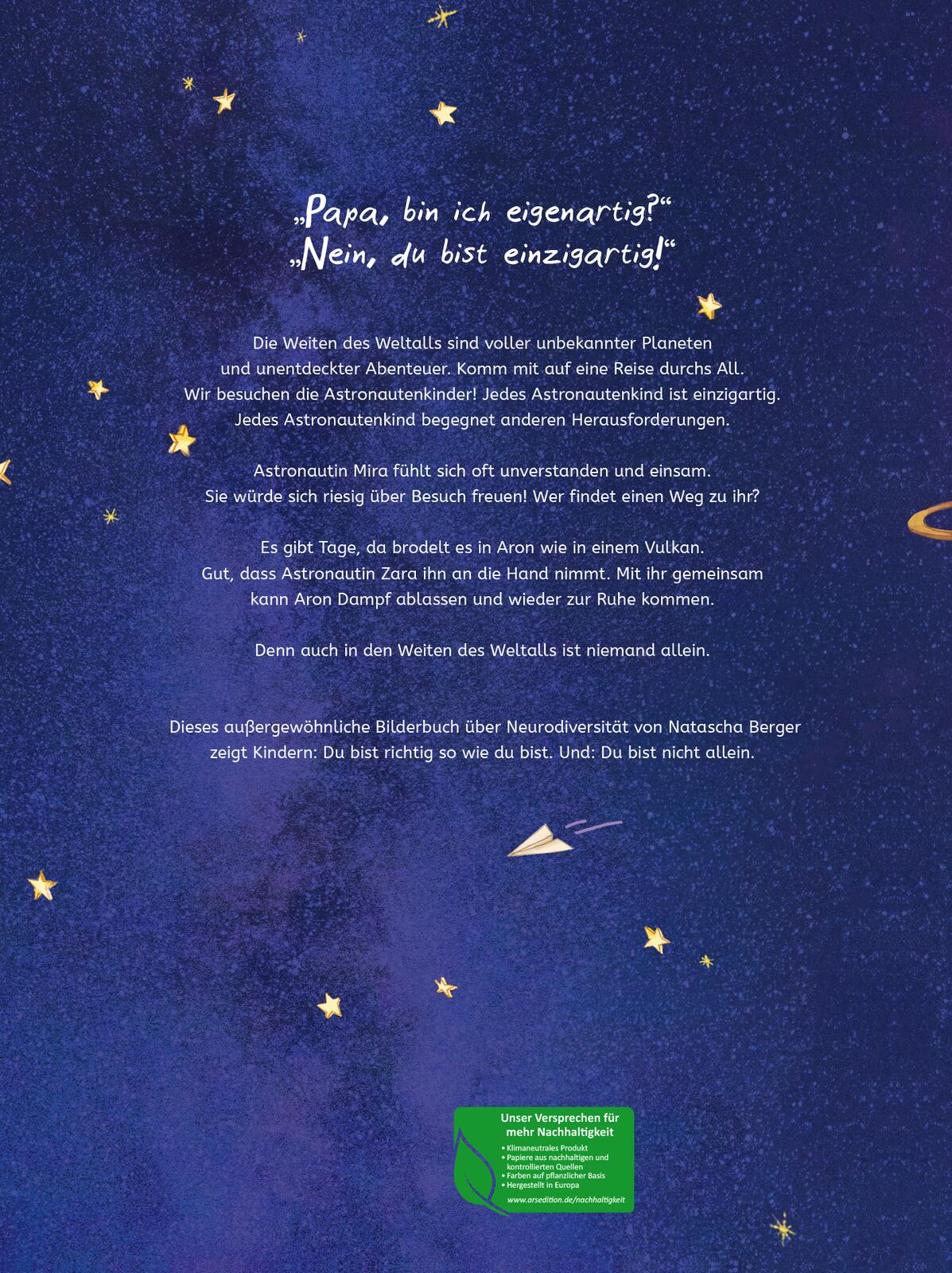 „Das klingt nach einem Kinderbuch.“ Diesen Satz sagt Natascha Berger wahrscheinlich öfter als „Hallo“. Sie liebt es, fantastische Geschichten zu erzählen und neue Welten zu erschaffen. Außerdem hat sie ein besonderes Interesse an Projekten, die Inklusion und Verständnis fördern. Nach ihrem Designstudium mit Schwerpunkt Illustration in Münster, lebt und arbeitet Natascha Berger nun in der Nähe von Wien. Die Astronautenkinder entstanden ursprünglich im Rahmen ihrer Abschlussarbeit.