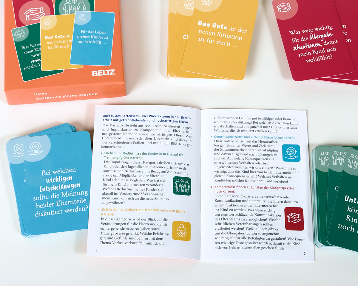 Das Kartenset besteht aus Fragen und Impulskarten zu vier Wirkfaktoren in der Elternarbeit mit strittigen oder getrennt lebenden Eltern: