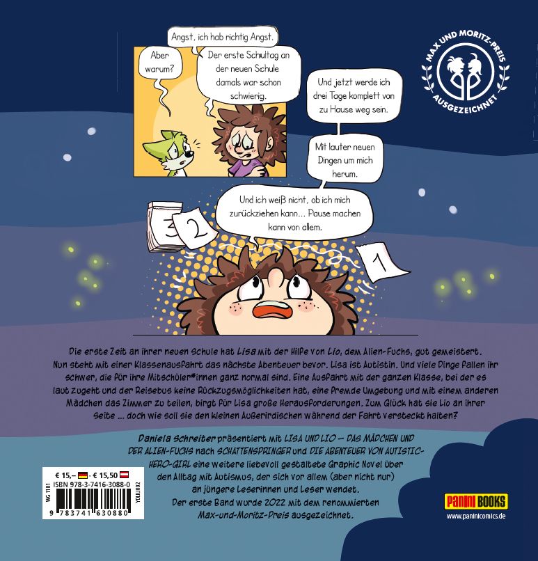 | Schlagworte | Alienfuchs • Alien-Fuchs • Alltagsbewältigung • Anders sein • ASD • ASS • auf dem Spektrum sein • Autismus • Autismus für Kinder erklärt • Comic • Comics • Daniela Schreiter • Fuchskind • h22 • Klassenfahrt • Lisa und Lio • Lisa und Lio 2 • Max und Moritz Preis • Neurodiversität • Panini • Panini Comics • Preisgekrönt • Reizüberflutung • Schattenspringer • Schullandheim • Wrong Planet Syndrom |