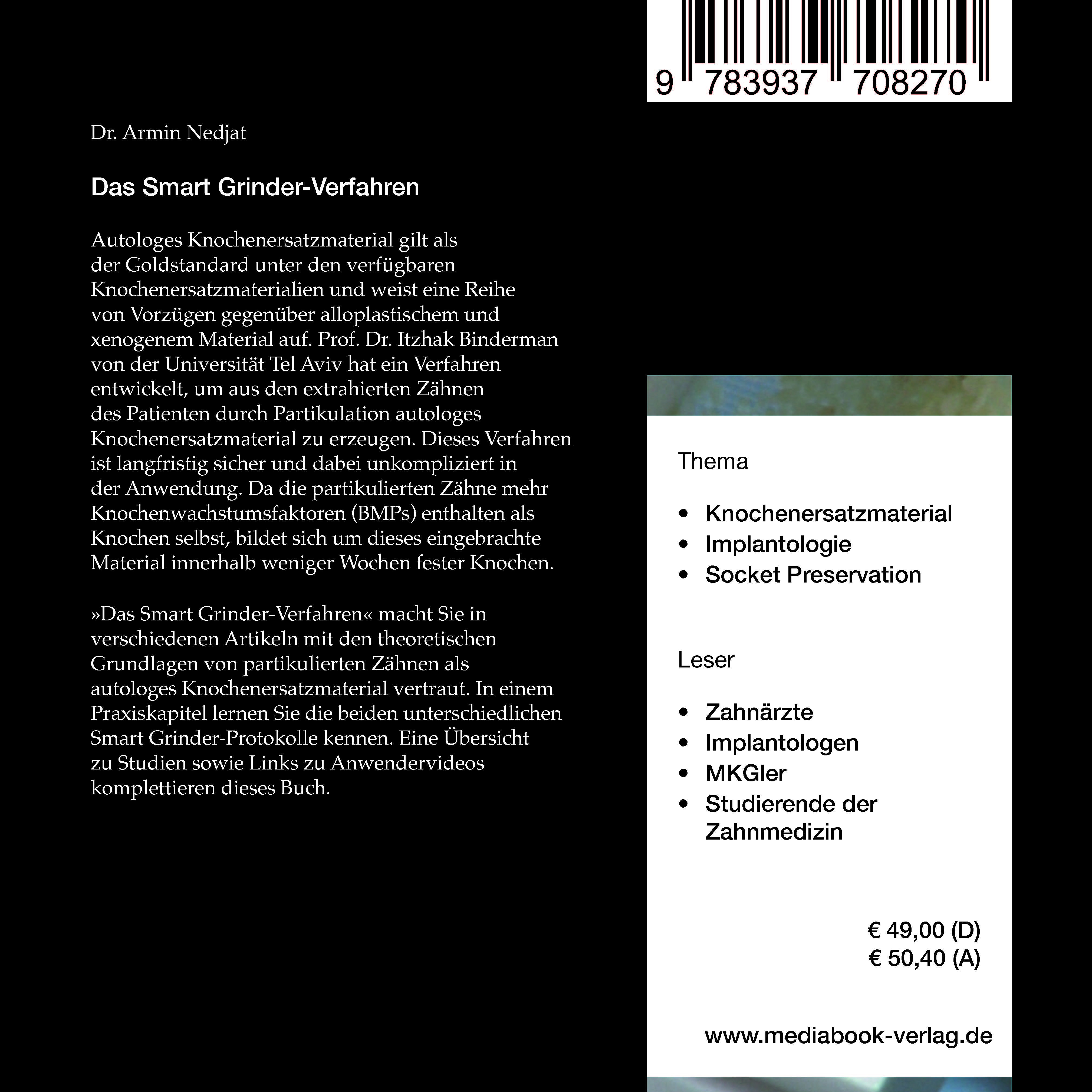 »Das Smart Grinder-Verfahren« macht Sie in verschiedenen Artikeln mit den theoretischen Grundlagen von partikulierten Zähnen als autologes Knochenersatzmaterial vertraut. In einem Praxiskapitel lernen Sie die beiden unterschiedlichen Smart Grinder-Protokolle kennen. Eine Übersicht zu Studien sowie Links zu Anwendervideos komplettieren dieses Buch.