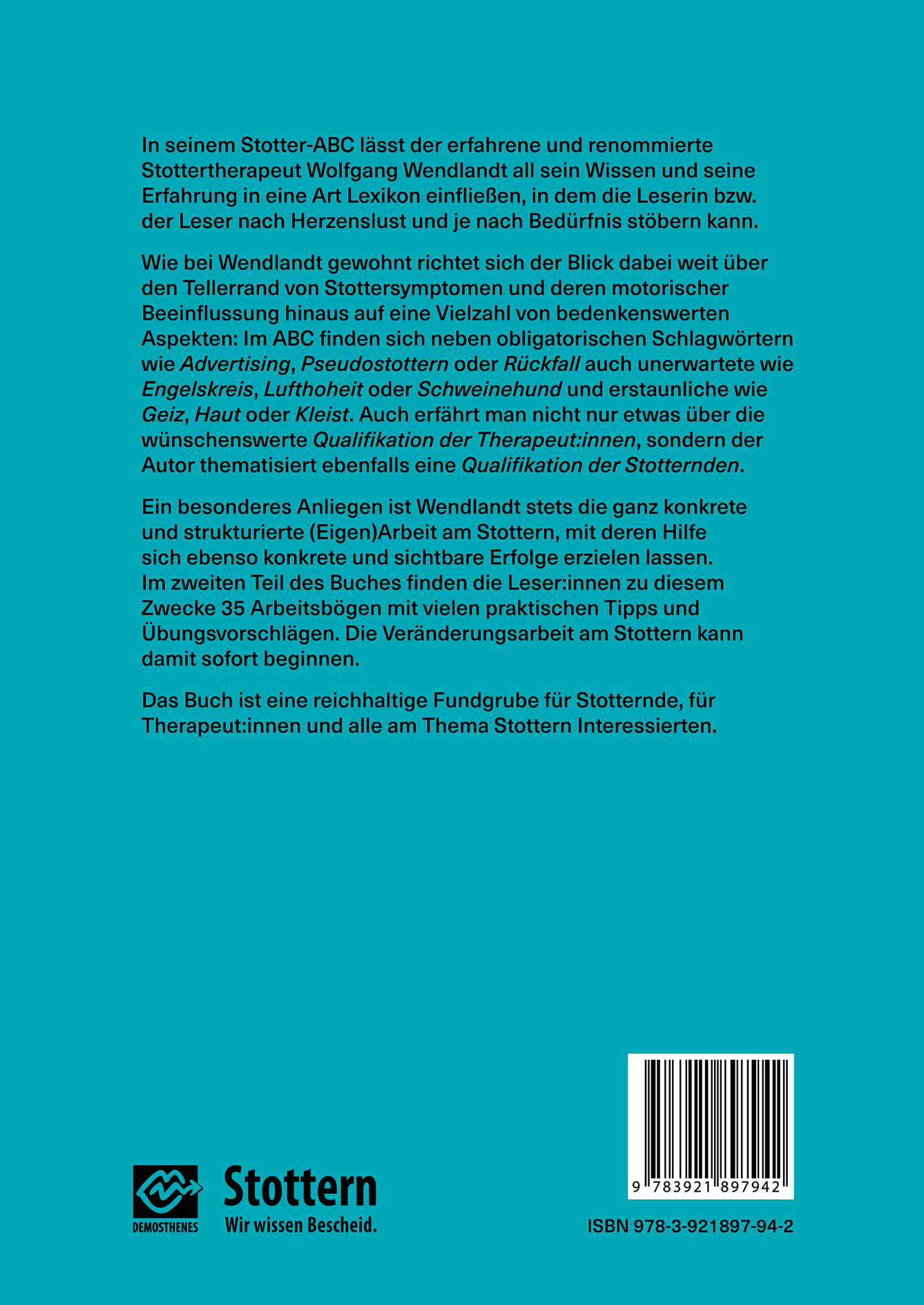 In seinem Stotter-ABC lässt der erfahrene und renommierte Stottertherapeut Wolfgang Wendlandt all sein Wissen und seine Erfahrung in eine Art Lexikon einfließen, in dem die Leserin bzw. der Leser nach Herzenslust und je nach Bedürfnis stöbern kann.Wie bei Wendlandt gewohnt richtet sich der Blick dabei weit über den Tellerrand von Stottersymptomen und deren motorischer Beeinflussung hinaus auf eine Vielzahl von bedenkenswerten Aspekten: Im ABC finden sich neben obligatorischen Schlagwörtern wie Advertising, Pseudostottern oder Rückfall auch unerwartete wie Engelskreis, Lufthoheit oder Schweinehund und erstaunliche wie Geiz, Haut oder Kleist. Auch erfährt man nicht nur etwas über die wünschenswerte Qualifikation der Therapeut:innen, sondern der Autor thematisiert ebenfalls eine Qualifikation der Stotternden.Ein besonderes Anliegen ist Wendlandt stets die ganz konkrete und strukturierte (Eigen)Arbeit am Stottern, mit deren Hilfe sich ebenso konkrete und sichtbare Erfolge erzielen lassen.Im zweiten Teil des Buches finden die Leser:innen zu diesem Zwecke 35 Arbeitsbögenmit vielen praktischen Tipps und Übungsvorschlägen. Die Veränderungsarbeit am Stottern kann damit sofort beginnen.Das Buch ist eine reichhaltige Fundgrube für Stotternde, für Therapeut:innen und alle am Thema Stottern Interessierten.