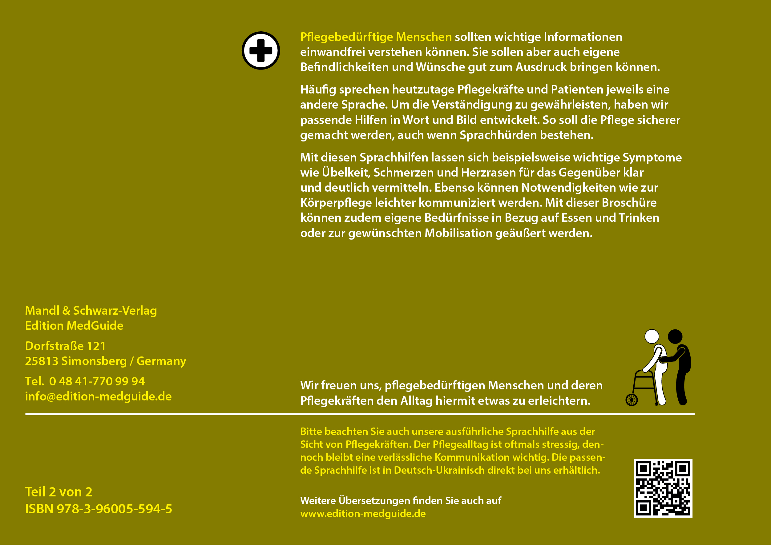 Bitte beachten Sie auch unsere ausführliche Sprachhilfe aus der Sicht von Pflegekräften. Der Pflegealltag ist oftmals stressig, dennoch bleibt eine verlässliche Kommunikation wichtig. Die passende Sprachhilfe ist in Deutsch-Ukrainisch direkt bei uns erhältlich.