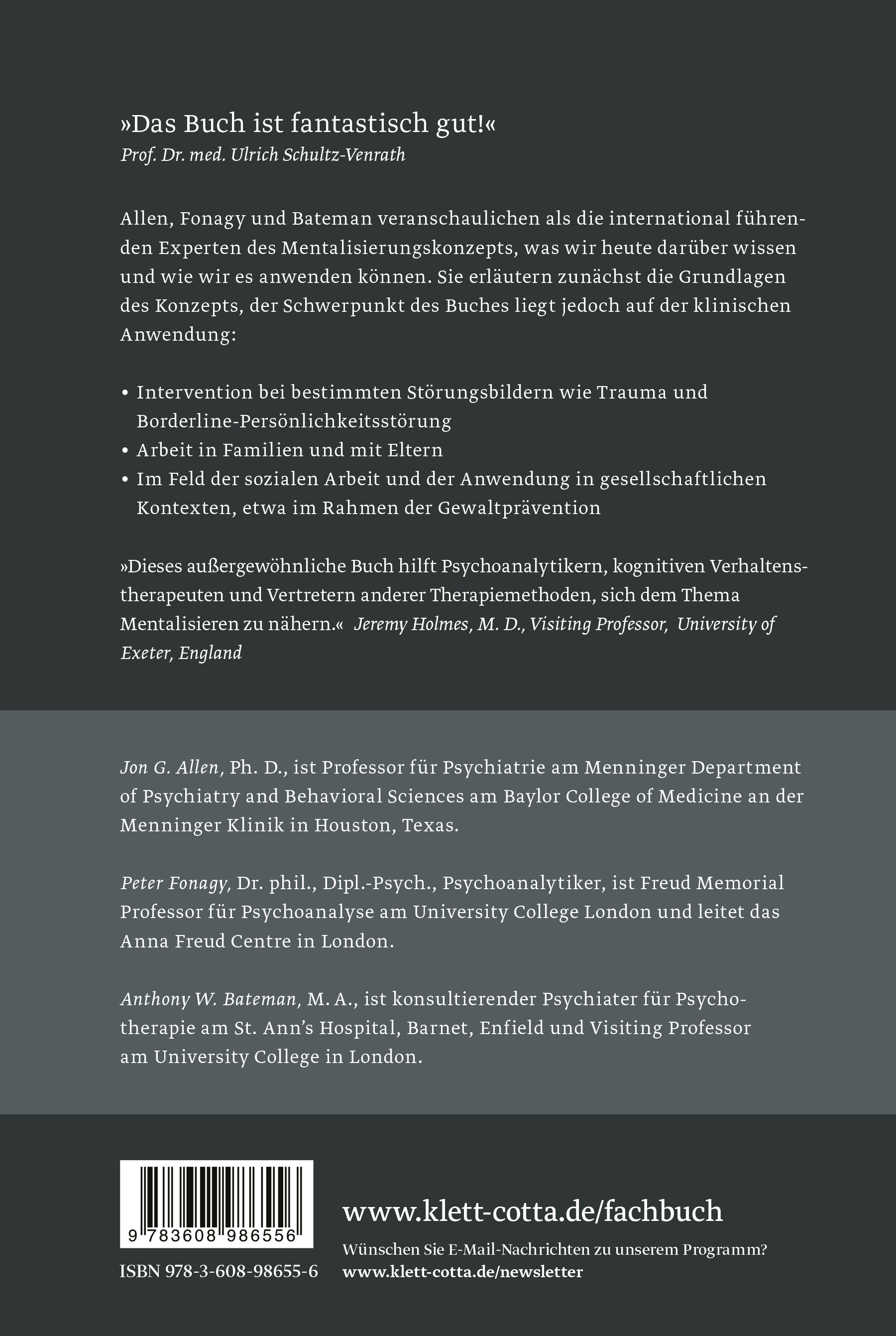 Allen, Fonagy und Bateman veranschaulichen, was wir heute über das Mentalisierungskonzept wissen und wie wir es anwenden können. Sie erläutern zunächst die Grundlagen des Konzepts, der Schwerpunkt des Buches liegt jedoch auf der klinischen Anwendung.