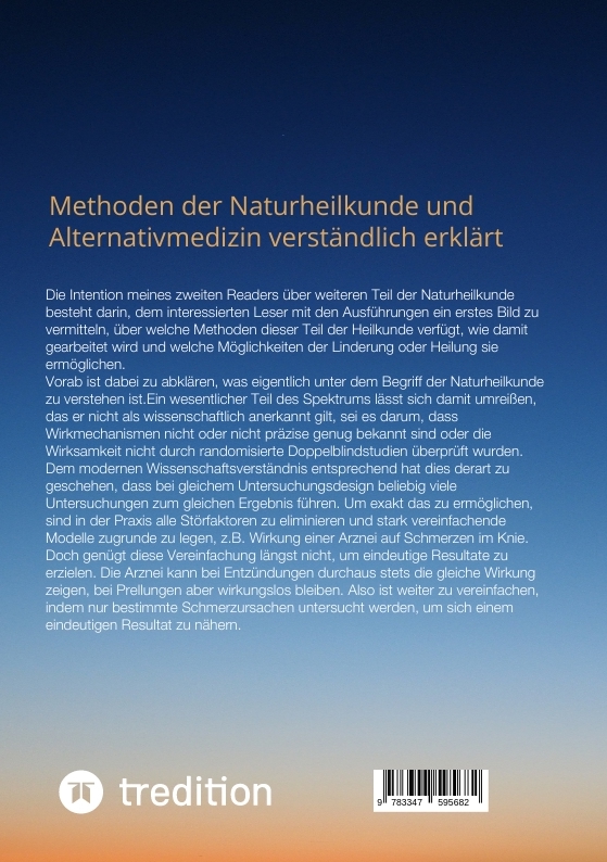 Die Intention meines zweiten Readers über weiteren Teil der Naturheilkunde besteht darin, dem interessierten Leser mit den Ausführungen ein erstes Bild zu vermitteln, über welche Methoden dieser Teil der Heilkunde verfügt, wie damit gearbeitet wird und welche Möglichkeiten der Linderung oder Heilung sie ermöglichen.Vorab ist dabei zu abklären, was eigentlich unter dem Begriff der Naturheilkunde zu verstehen ist.Ein wesentlicher Teil des Spektrums lässt sich damit umreißen, das er nicht als wissenschaftlich anerkannt gilt, sei es darum, dass Wirkmechanismen nicht oder nicht präzise genug bekannt sind oder die Wirksamkeit nicht durch randomisierte Doppelblindstudien überprüft wurden. Dem modernen Wissenschaftsverständnis entsprechend hat dies derart zu geschehen, dass bei gleichem Untersuchungsdesign beliebig viele Untersuchungen zum gleichen Ergebnis führen.