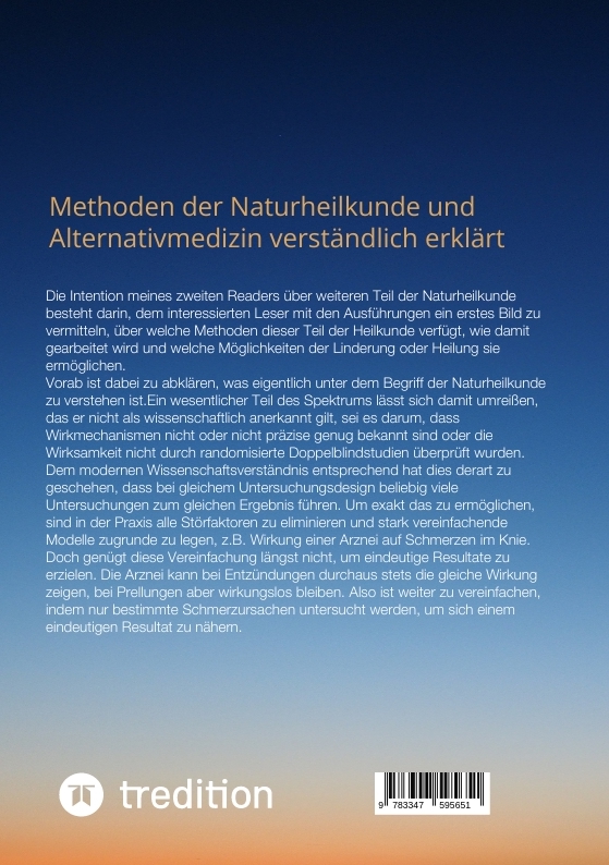 Die Intention meines zweiten Readers über weiteren Teil der Naturheilkunde besteht darin, dem interessierten Leser mit den Ausführungen ein erstes Bild zu vermitteln, über welche Methoden dieser Teil der Heilkunde verfügt, wie damit gearbeitet wird und welche Möglichkeiten der Linderung oder Heilung sie ermöglichen.Vorab ist dabei zu abklären, was eigentlich unter dem Begriff der Naturheilkunde zu verstehen ist.Ein wesentlicher Teil des Spektrums lässt sich damit umreißen, das er nicht als wissenschaftlich anerkannt gilt, sei es darum, dass Wirkmechanismen nicht oder nicht präzise genug bekannt sind oder die Wirksamkeit nicht durch randomisierte Doppelblindstudien überprüft wurden. Dem modernen Wissenschaftsverständnis entsprechend hat dies derart zu geschehen, dass bei gleichem Untersuchungsdesign beliebig viele Untersuchungen zum gleichen Ergebnis führen.