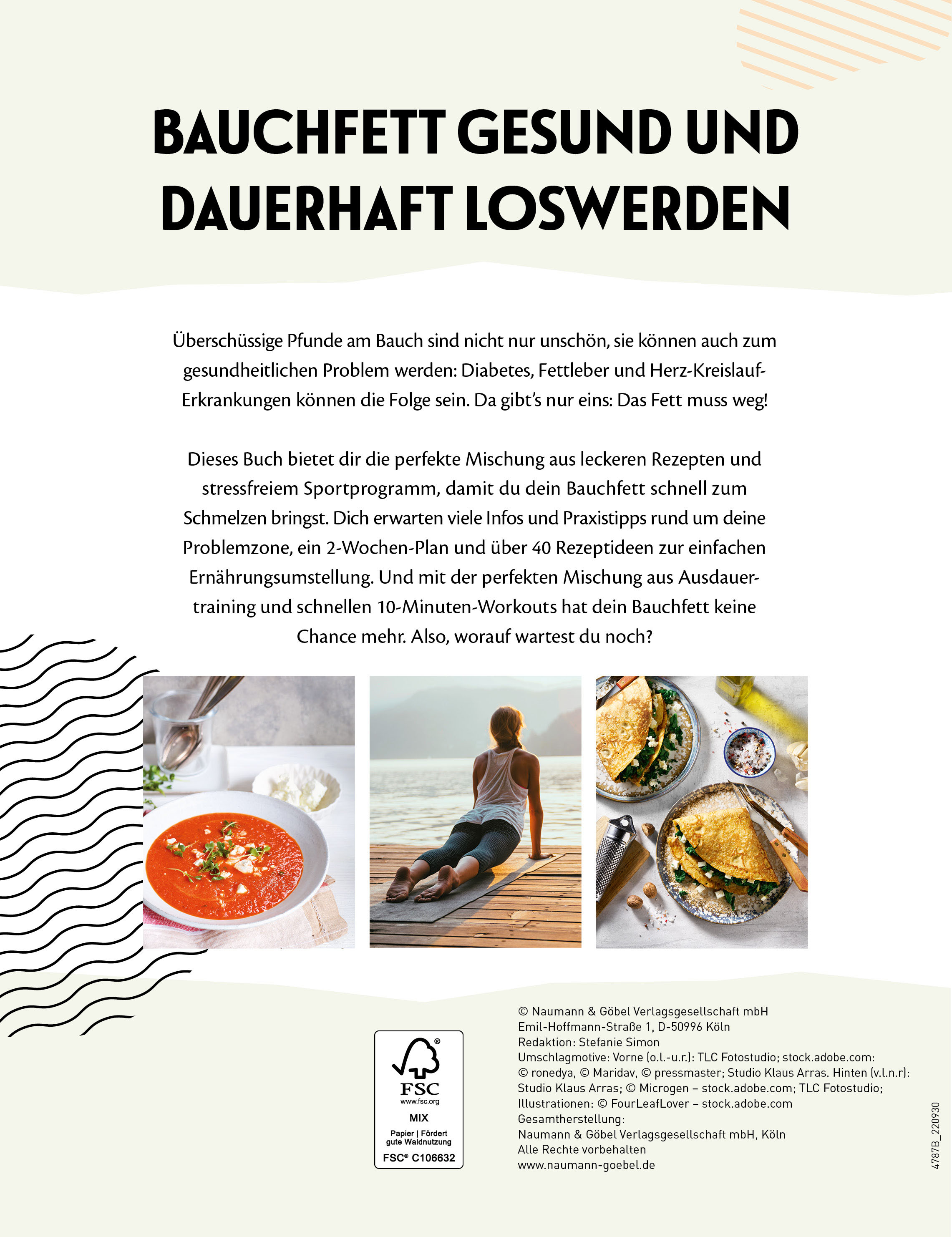 Die gute Nachricht: Dieses Buch bietet die perfekte Mischung aus über 40 leckeren Rezepten und einem stressfreiem Sportprogramm, damit Sie Ihr Bauchfett schnell wieder loswerden. Dazu gibt es eine umfangreiche Einleitung, die erläutert wie Bauchfett entsteht, welche negativen Folgen damit einhergehen können und wie Sie Bauchfett am eigenen Körper feststellen können. Ernährungswissenschaftliche Tipps helfen bei der Umstellung auf eine gesunde, ausgewogene Ernährung mit viel Gemüse, wertvollen Eiweißen und guten Fetten, die schnell beim Abnehmen hilft. Einen leichten Einstieg unterstützen über 40 leckere Rezepte und ein 2-Wochen-Speiseplan, der keine Wünsche offen lässt.
