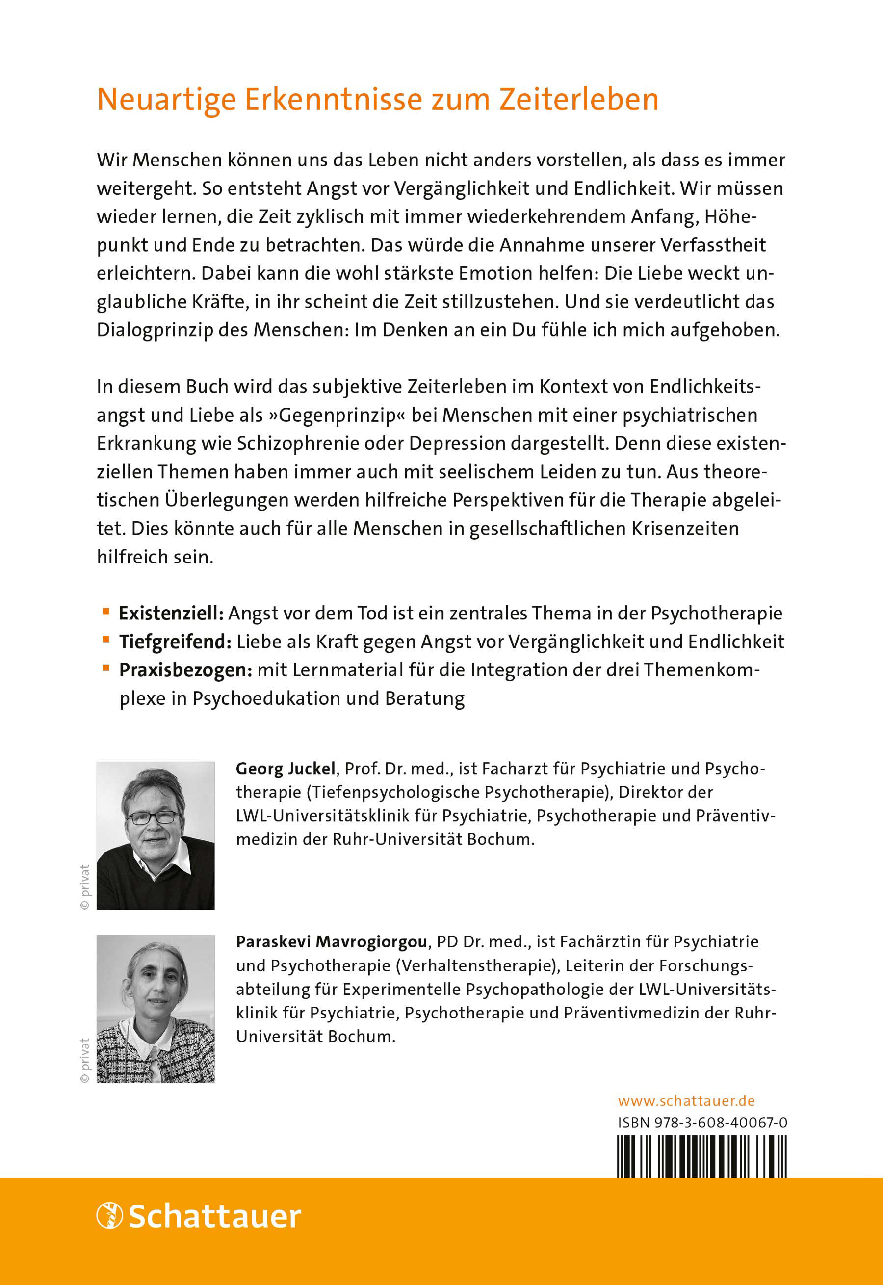 | Schlagworte | Angst vor dem Tod • Auseinandersetzung mit dem Tod • Depression • Endlichkeitsangst • Erlösung • Psychothanatologie • Schizophrenie • Sterben • Störungen des Zeiterlebens • Terror Management • Terror-Management-Theorie • Tod • Zeiterleben • Zeiterleben bei psychisch Kranken |
