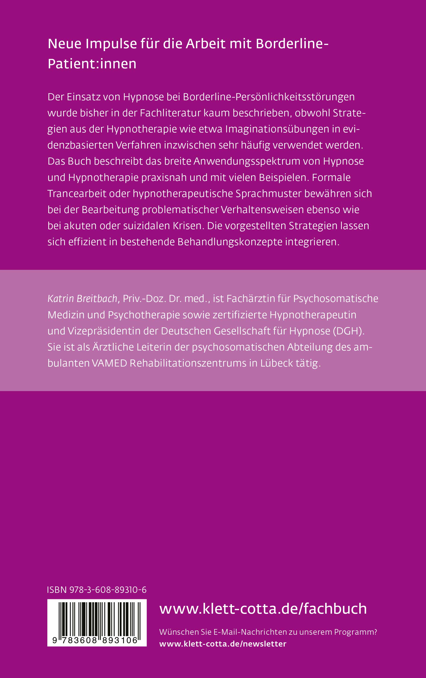 | Schlagworte | Achtsamkeit • Arbeit mit Metaphern • Borderline-Störung • DBT-Konzept • Hypnosetechniken • hypnotherapeutische Interventionen • hypnotherapeutische Kommunikation • Hypnotherapeutische Sprachmuster • Hypnotherapie • Imagination • Imaginationsarbeit • Imaginationsübungen • innerer sicherer Ort • Neurobiologie • Persönlichkeitsstörungen • Suizidalität • Therapeutische Geschichten • Trance • Tranceinduktion |