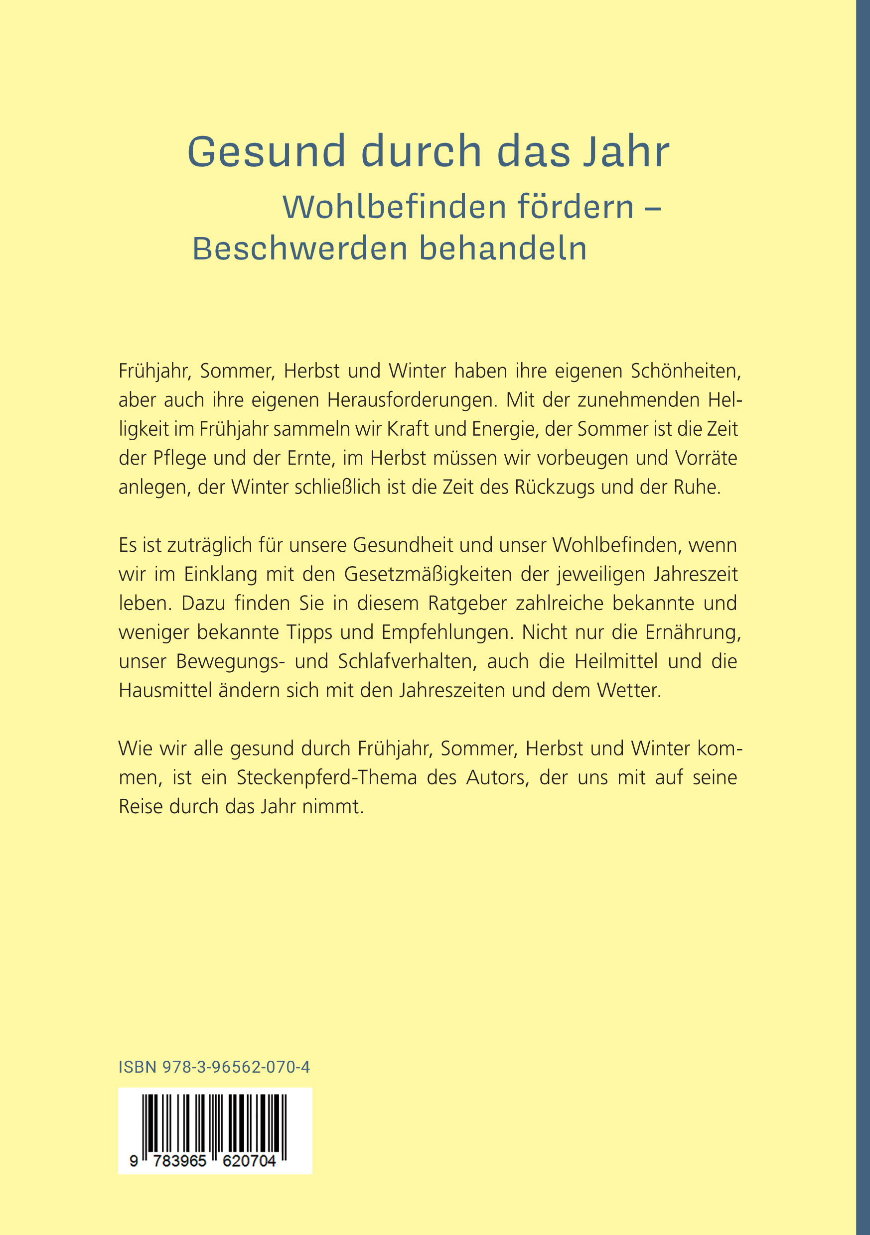Frühjahr, Sommer, Herbst und Winter haben ihre eigenen Schönheiten, aber auch ihre eigenen Herausforderungen. Mit der zunehmenden Helligkeit im Frühjahr sammeln wir Kraft und Energie, der Sommer ist die Zeit der Pfl ege und der Ernte, im Herbst müssen wir vorbeugen und Vorräte anlegen, der Winter schließlich ist die Zeit des Rückzugs und der Ruhe.Es ist zuträglich für unsere Gesundheit und unser Wohlbefi nden, wenn wir im Einklang mit den Gesetzmäßigkeiten der jeweiligen Jahreszeit leben. Dazu finden Sie in diesem Ratgeber zahlreiche bekannte und weniger bekannte Tipps und Empfehlungen. Nicht nur die Ernährung, unser Bewegungs- und Schlafverhalten, auch die Heilmittel und die Hausmittel ändern sich mit den Jahreszeiten und dem Wetter.Wie wir alle gesund durch Frühjahr, Sommer, Herbst und Winter kommen, ist ein Steckenpferd-Thema des Autors, der uns mit auf seine Reise durch das Jahr nimmt.