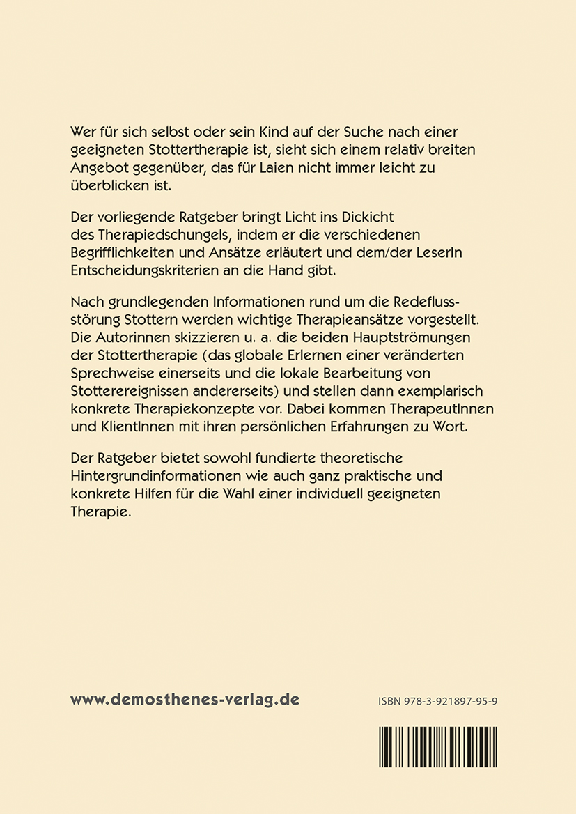 Liebe Leserin, lieber Leser,Sie sind also aktuell auf der Suche nach einer Stottertherapie für sich bzw. für Ihr Kind - oder denken zumindest darüber nach. Keine leichte Entscheidung, womöglich gehen Ihnen gerade viele Fragen durch den Kopf: Welche Therapie ist für mich bzw. mein Kind geeignet? Worauf sollte ich bei der Auswahl einer Therapieform achten? Und was macht eigentlich eine gute Stottertherapie aus? Mit unserer Entscheidungshilfe zur Stottertherapie1 bieten wir als Betroffenenverband bereits eine erste Orientierung. Viel tiefgreifender gelingt dies mit dem vorliegenden Ratgeber, der Ihnen einen aktuellen Überblick über die verschiedenen Therapieansätze und -formen im Bereich von Stottern geben soll.Als Selbsthilfevereinigung und Interessenvertretung stotternder Menschen wissen wir aus eigener Erfahrung nur zu gut, wie wichtig es ist, sich vor Beginn einer Therapie ausreichend und eingehend zu informieren. Die einzelnen Therapieansätze unterscheiden sich mitunter deutlich voneinander - mal steht das Erlernen von Sprechtechniken im Vordergrund, mal geht es primär um den Angstabbau beim Sprechen. Egal ob als jugendlicher oder erwachsener Stotternder oder als Elternteil eines stotternden Kindes sollten Sie wissen und verstehen, was in der Therapie passiert und was Sie erwartet. Eine Stottertherapie erfordert neben dem Wunsch und den Mut zur Veränderung, auch meist viel Zeit, Arbeit und Ausdauer. Der begleitende Austausch in der Selbsthilfe kann zudem nach unserer Erfahrung eine gute Unterstützung zur Therapie sein.Der vorliegende Ratgeber stellt Ihnen nicht nur verschiedene seriöse Therapieansätze im Bereich der Stottertherapie vor, sondern gibt Ihnen auch Entscheidungskriterien für die Wahl einer Therapieform an die Hand. Durch persönliche Erfahrungswerte von Betroffenen und TherapeutInnen erhalten Sie außerdem einen lebendigen Eindruck in einzelne Therapiekonzepte. Wir wünschen Ihnen nun viel Freude bei der Lektüre des Buches und freuen uns, wenn wir Ihnen mit unserem Therapieratgeber bei Ihrer Entscheidungsfindung für eine Stottertherapie weiterhelfen können!