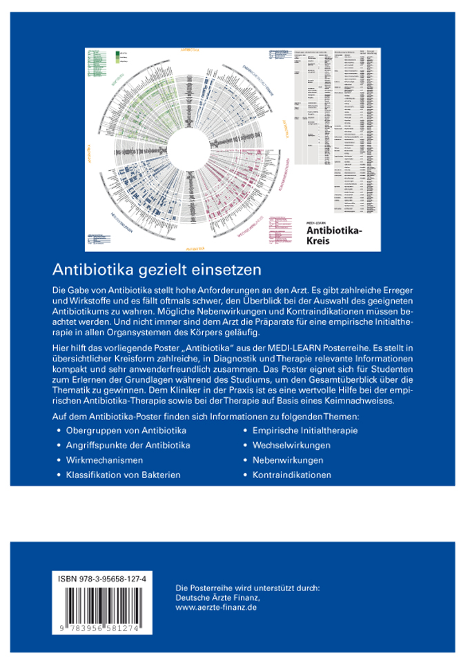 Hier hilft das vorliegende Poster „Antibiotika“ aus der MEDI-LEARN Posterreihe. Es stellt in übersichtlicher Kreisform zahlreiche, in Diagnostik und Therapie relevante Informationen kompakt und sehr anwenderfreundlich zusammen. Das Poster eignet sich für Studenten zum Erlernen der Grundlagen während des Studiums, um den Gesamtüberblick über die Thematik zu gewinnen. Dem Kliniker in der Praxis ist es eine wertvolle Hilfe bei der empirischen Antibiotika-Therapie sowie bei der Therapie auf Basis eines Keimnachweises.