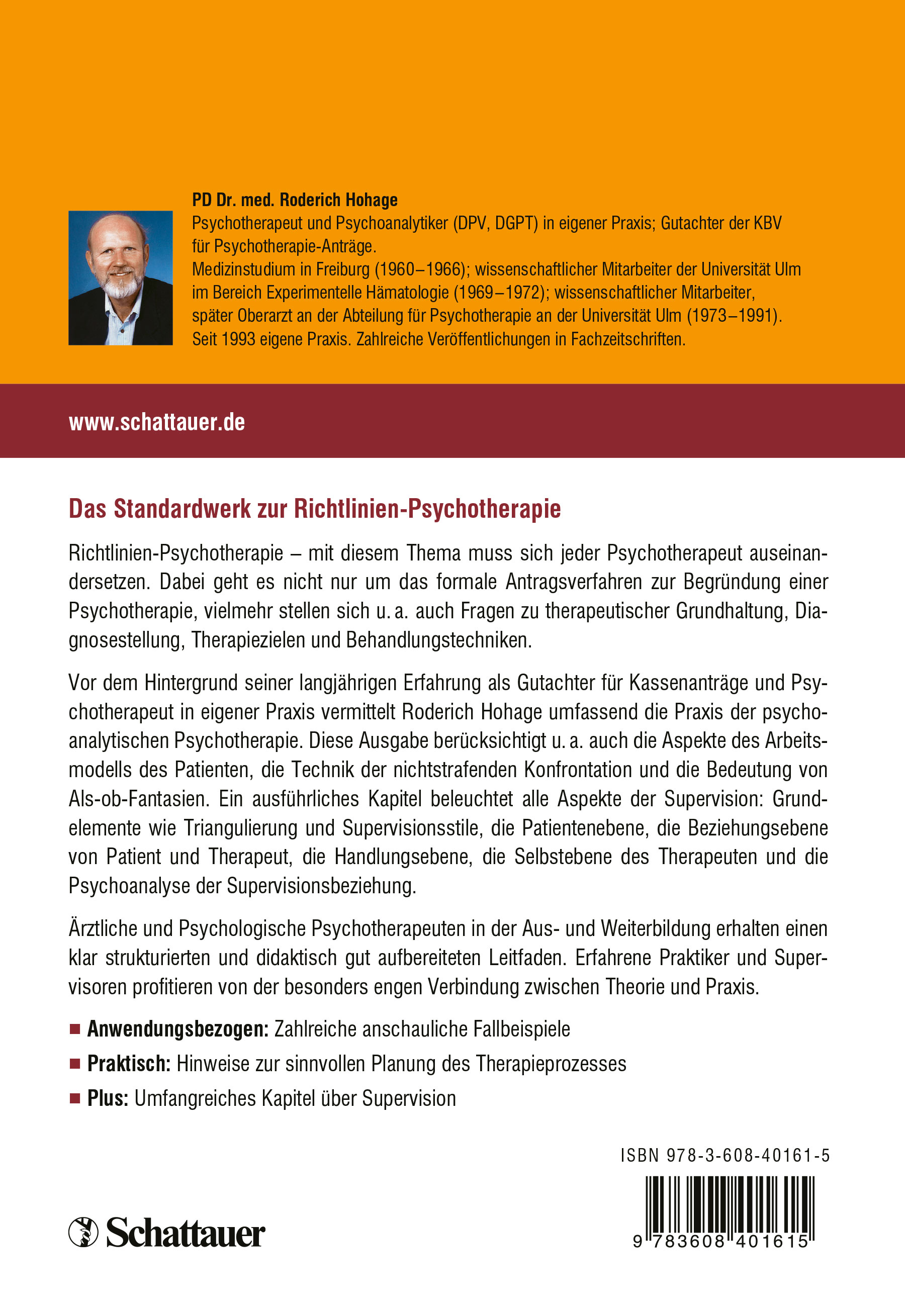 Vor dem Hintergrund seiner langjährigen Erfahrung als Gutachter für Kassenanträge und Psychotherapeut in eigener Praxis vermittelt Roderich Hohage umfassend die Praxis der psychoanalytischen Psychotherapie. Diese Ausgabe berücksichtigt u. a. auch die Aspekte des Arbeitsmodells des Patienten, die Technik der nichtstrafenden Konfrontation und die Bedeutung von Als-ob-Fantasien. Ein ausführliches Kapitel beleuchtet alle Aspekte der Supervision: Grundelemente wie Triangulierung und Supervisionsstile, die Patientenebene, die Beziehungsebene von Patient und Therapeut, die Handlungsebene, die Selbstebene des Therapeuten und die Psychoanalyse der Supervisionsbeziehung.