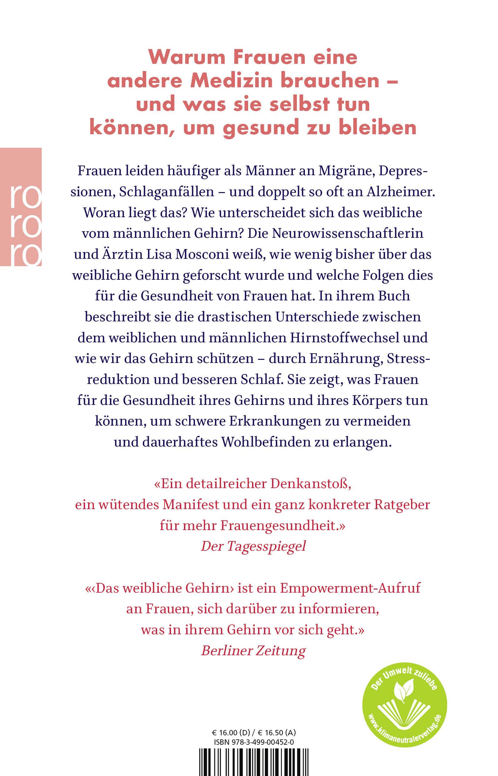 Frauen leiden häufiger als Männer an Migräne, Depressionen, Schlaganfällen - und doppelt so oft an Alzheimer. Woran liegt das? Wie unterscheidet sich das weibliche vom männlichen Gehirn? Die Neurowissenschaftlerin und Ärztin Lisa Mosconi weiß, wie wenig bisher über das weibliche Gehirn geforscht wurde und welche Folgen dies für die Gesundheit von Frauen hat. In ihrem Buch beschreibt sie die drastischen Unterschiede zwischen dem weiblichen und männlichen Hirnstoffwechsel und wie wir das Gehirn schützen - durch Ernährung, Stressreduktion und besseren Schlaf. Dieses Buch zeigt, was Frauen für die Gesundheit ihres Gehirns und ihres Körpers tun können, um schwere Erkrankungen zu vermeiden und dauerhaftes Wohlbefinden zu erlangen.