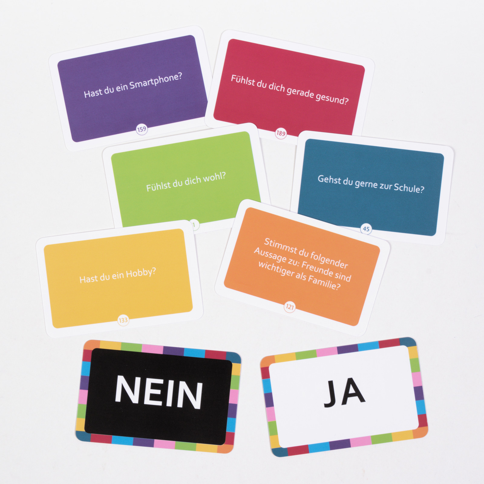 - 120 Karten mit über 200 Fragen, 6 Ja-oder-Nein-Karten