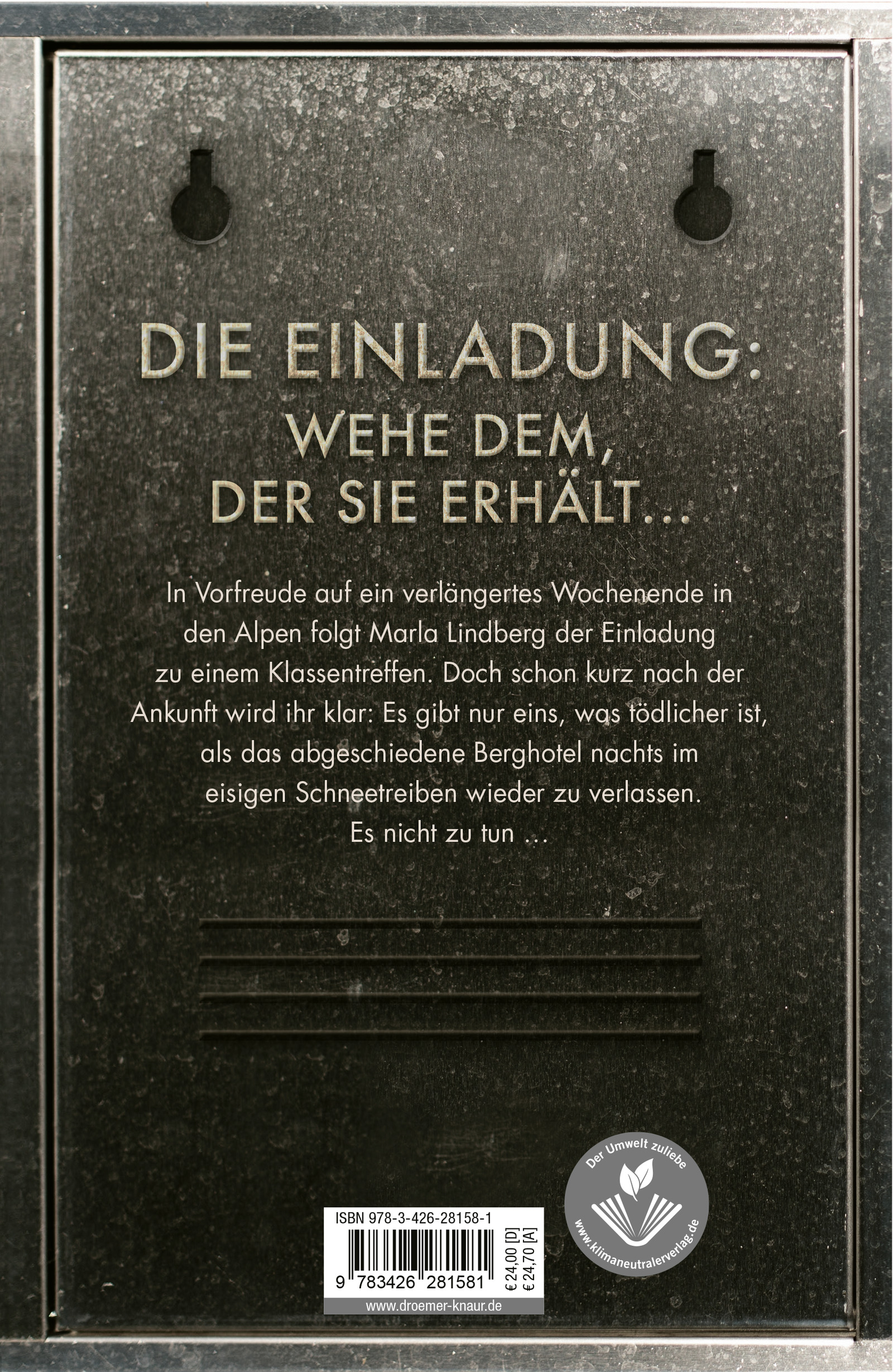 In Vorfreude auf ein verlängertes Wochenende in den Alpen folgt Marla Lindberg der Einladung zu einem Klassentreffen. Doch schon kurz nach der Ankunft wird ihr klar: Es gibt nur eins, was tödlicher ist, als das abgeschiedene Berghotel nachts im eisigen Schneetreiben wieder zu verlassen. Es nicht zu tun ...