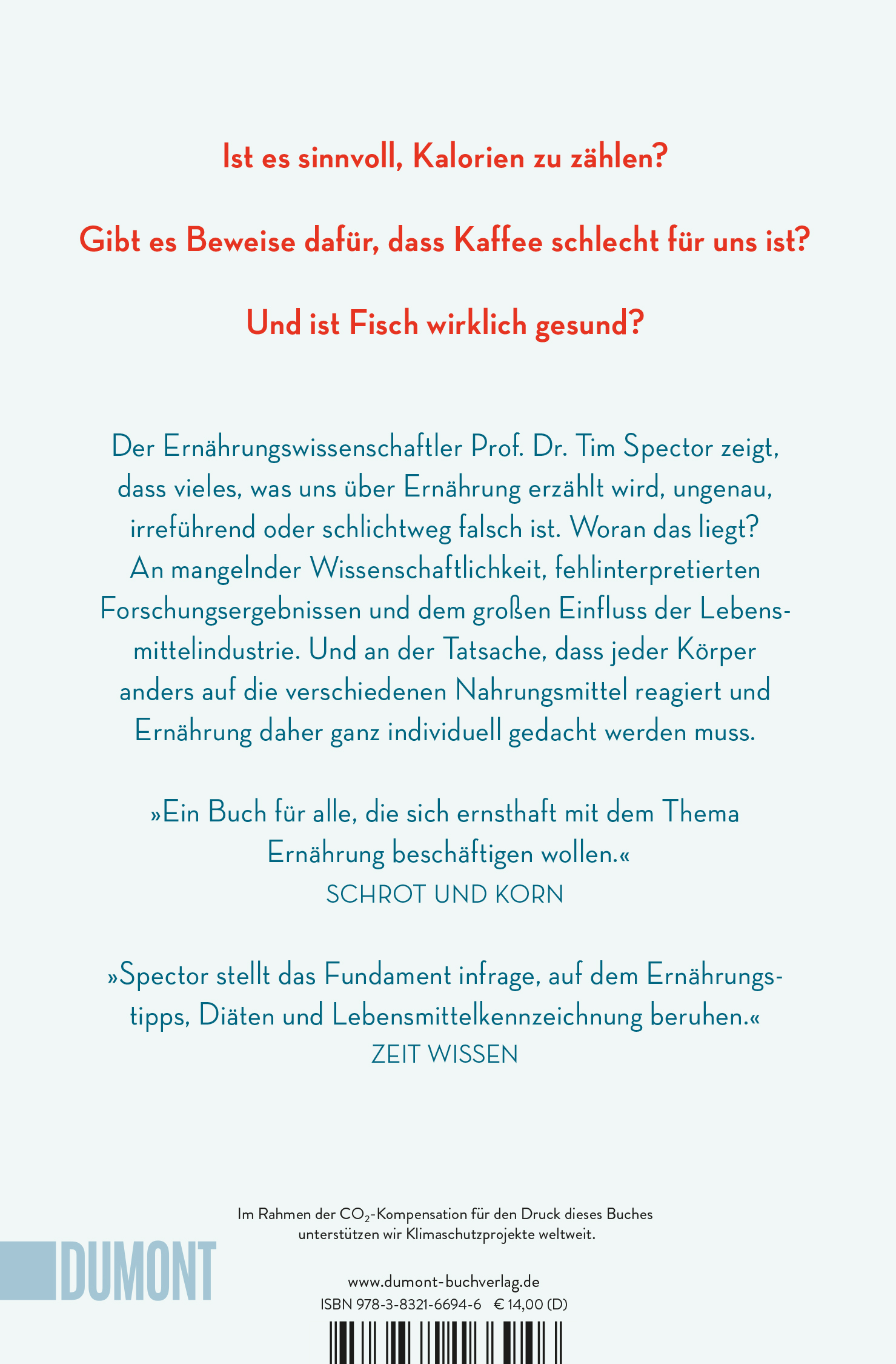 »Spector stellt das Fundament infrage, auf dem Ernährungstipps, Diäten und Lebensmittelkennzeichnung beruhen.« Max Rauner, ZEIT WISSEN »Auf intelligente und fundierte Weise hinterfragt Spector gängige Ernährungsmythen und tritt als besonnener Wissenschaftler auf, der nicht vorgibt, die Weisheit mit Löffeln gegessen zu haben.« Dr. Daniel Arnet, SONNTAGSBLICK »Ein hochinformatives Buch, klar und angenehm geschrieben und eigentlich eine Pflichtlektüre für alle, die gesund bleiben möchten.« Daniela Niederberger, WELTWOCHE »Tim Spectors Buch decouvriert Ernährungsmythen und erklärt, wie man beim Thema gesunde Ernährung künftig nur auf einen Experten zu hören braucht - auf sich selbst.« Holger Diedrich, P.M. »Ein Buch für alle, die sich ernsthaft mit dem Thema Ernährung beschäftigen wollen.« SCHROT UND KORN »Der britische Wissenschaftsautor Tim Spector sagt: Vieles, was lange als gesichertes Wissen über Ernährung galt, ist falsch. Aber er hat auch gute Nachrichten.« Katrin Hummel, FRANKFURTER ALLGEMEINE SONNTAGSZEITUNG »Ein hochinformatives Buch, klar und angenehm geschrieben und eigentlich eine Pflichtlektüre für alle, die gesund bleiben möchten und denen es nicht wurst ist, was sie essen.« Daniela Niederberger, DIE WELTWOCHE »In einer Welt, in der Ernährungstrends und Diäten dominieren, tritt Tim Spector hervor, um Klarheit zu schaffen.« Sven Trautwein, FRANKFURTER RUNDSCHAU »Eine spannende Lektüre, die auf jeden Fall beeinflusst, wie wir angeblichen Wahrheiten über unsere Ernährung begegnen.« Julia Evers, OÖ NACHRICHTEN »Verständlich und unterhaltsam« Roland Meyer-Arlt, HANNOVERSCHE ALLGEMEINE ZEITUNG »Ein tolles Buch für alle die eine andere Sichtweise auf Nahrung und gesunde Ernährung haben möchte und sich ausführlich mit dem Thema beschäftigt möchte.« Yvonne Döring Janaschke, GAUMENKINO KOELN